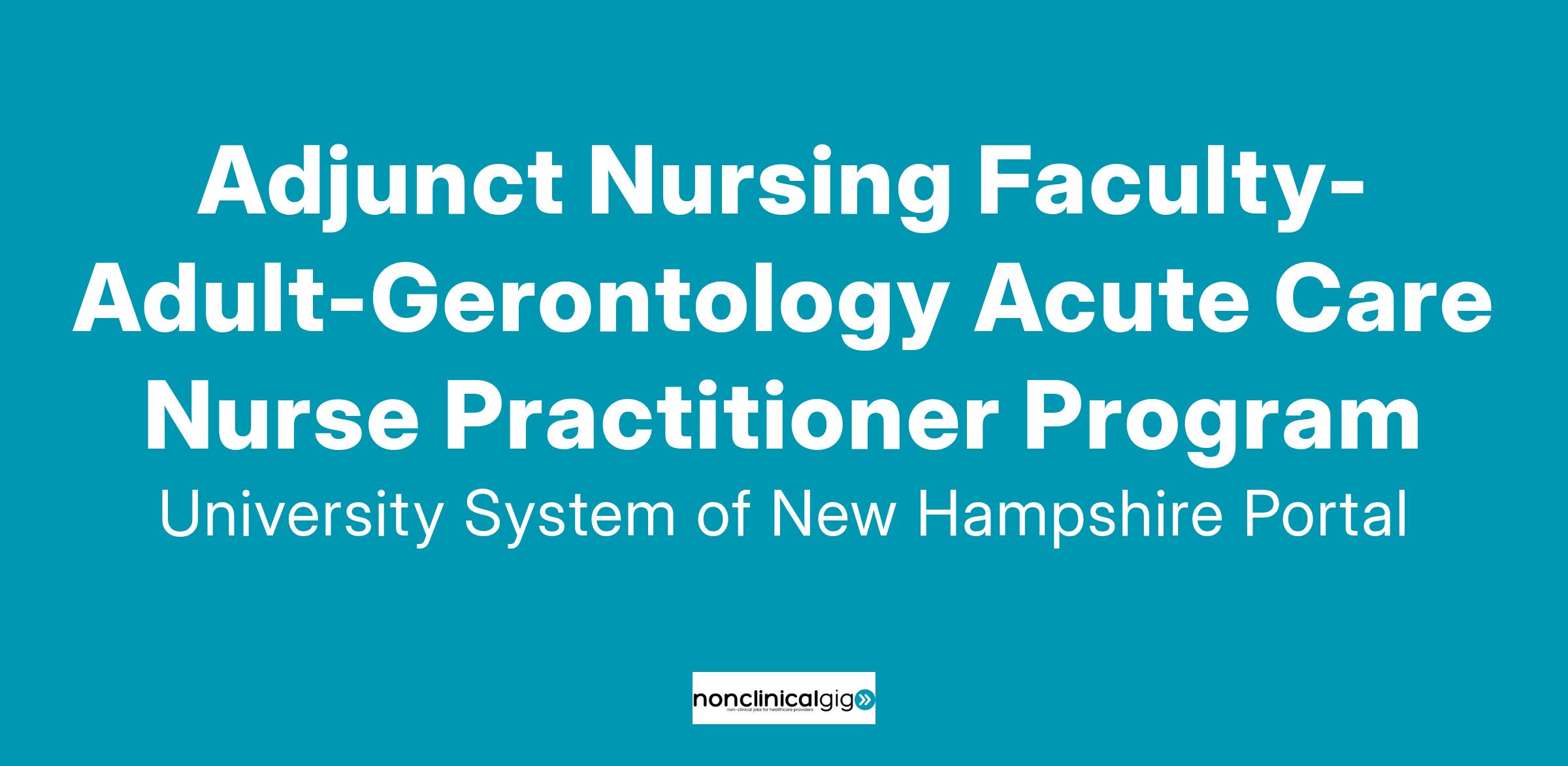 University of New Hampshire Nursing is seeking adjunct Adult Gerontology Acute Care Nurse Practitioner ( AGACNP ) faculty. The successful candidate will hold an Adult Gerontology Acute Care Nurse Practitioner Certification, and be able to be able to teach AGACNP content specific courses.