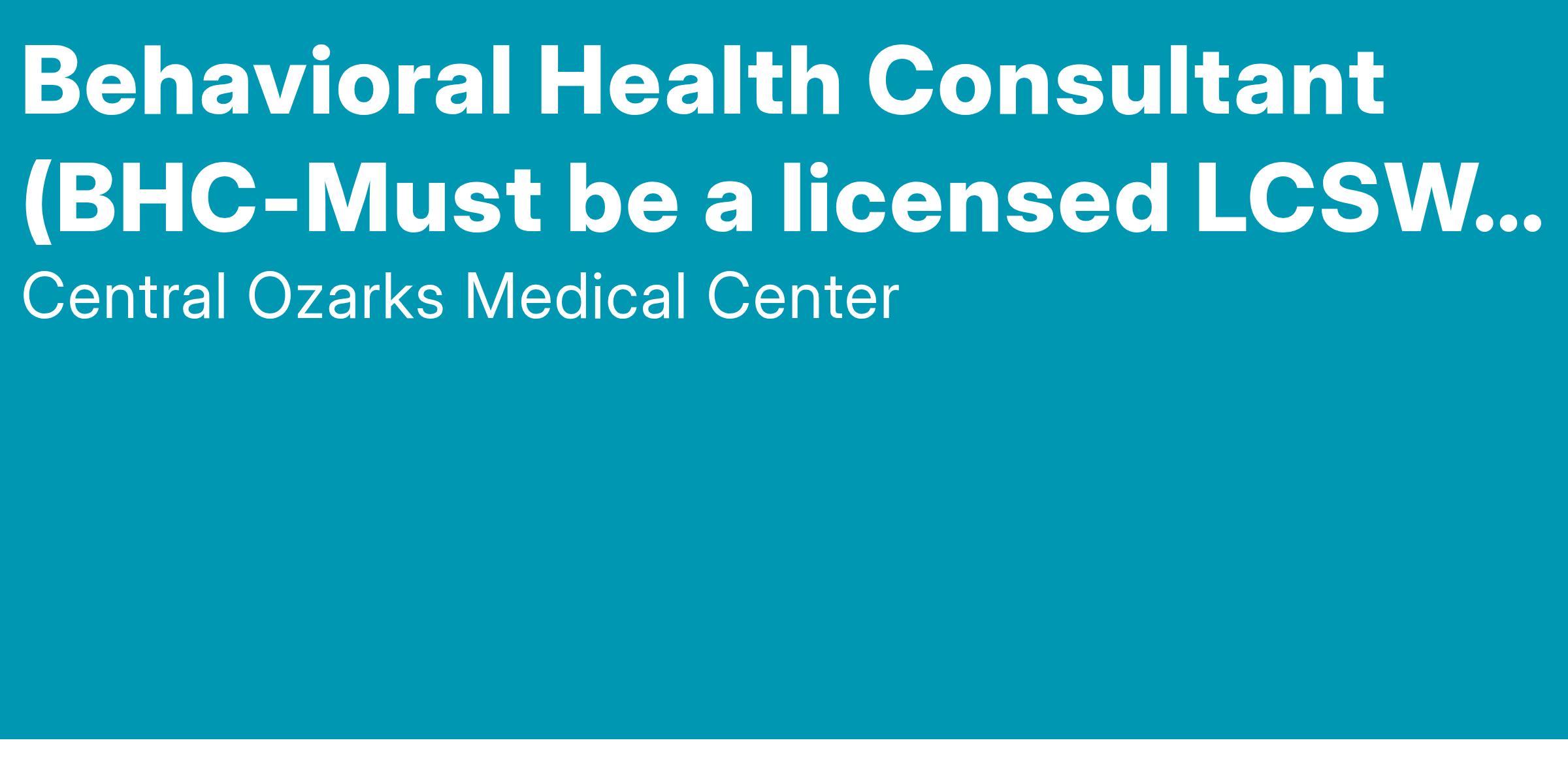 We are expanding our team to serve the needs of our community in the Lake of the Ozarks, Missouri area! Central Ozarks Medical Center (COMC) is excited to announce an opening for a Behavioral Health Consultant (BHC). In addition to base salary, each professional may be eligible for an annual salary adjustment and additionally, an annual incentive program.