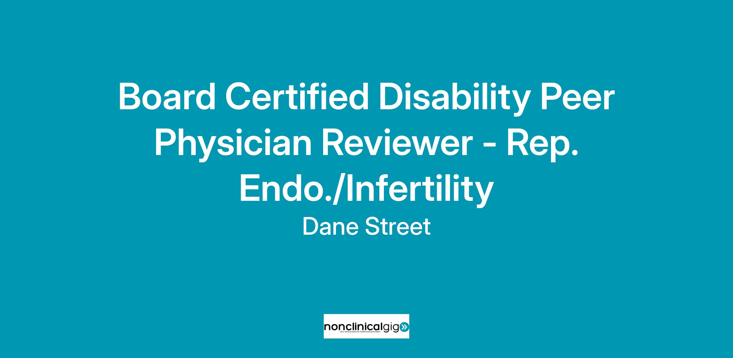 DescriptionDane Street is looking for Board Certified Physicians to join our Disability Peer Review team! This telework position provides an excellent opportunity for physicians to review and assess disability claims related to mental health conditions from the comfort of their own home. Our physician panel is comprised of independent contract reviewers (1099) who are compensated on a per-case basis, enabling flexible scheduling.