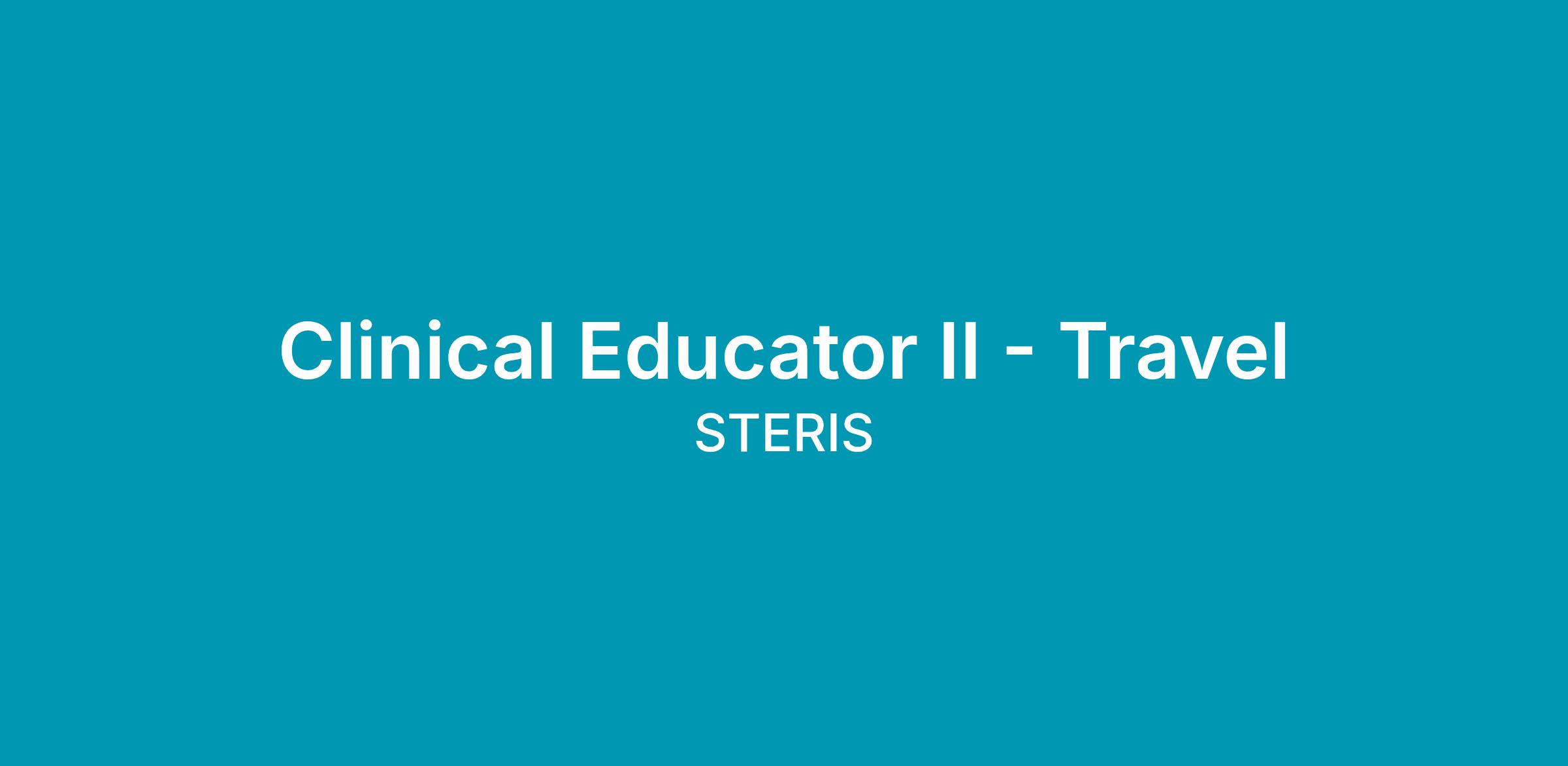 The Clinical Educator II – Travel ensures that Sterile Processing staff, both internal and external to STERIS, are properly trained and operating within the guidelines set forth by various industry standards and regulations including, but not limited to HSPA, CBSPD, AORN, The Joint Commission, FDA, CDC, DNV OSHA, AAMI and those of STERIS and its customer facilities. Performs various educational duties under supervision and guidance from Manager, Clinical Education, and/or onsite operations leadership. Potential to support and work alongside all instrument processing solutions to include but not limited to continuous improvement, off site reprocessing centers and/or outsourced engagements. Travel positions require up to 100% domestic travel.