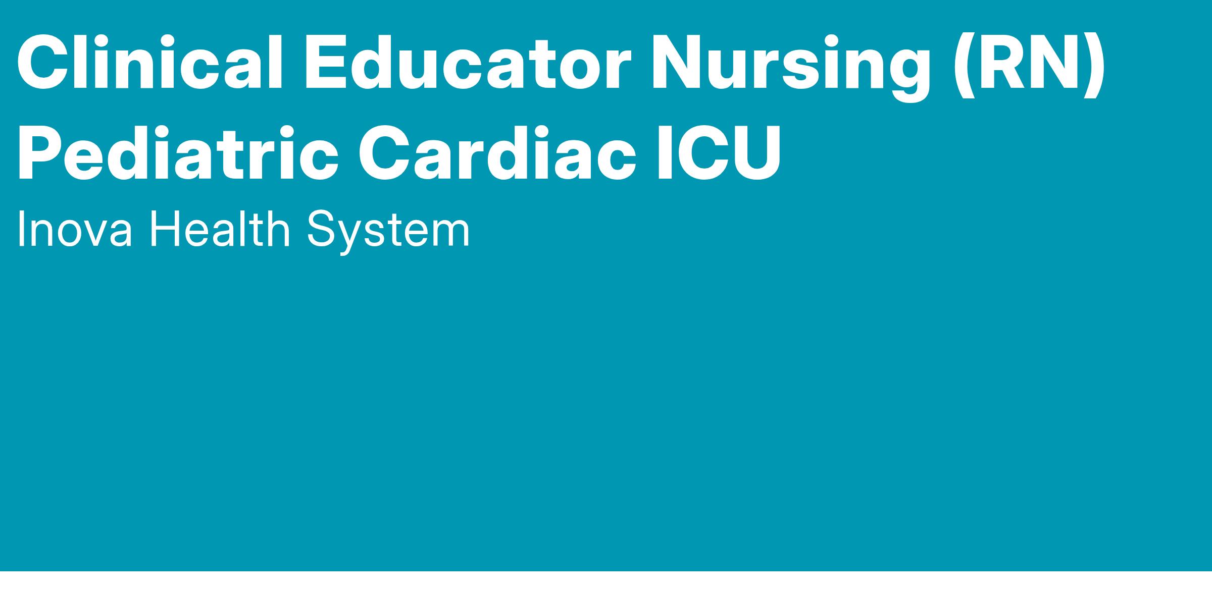 Inova Fairfax Medical Campus is looking for a RN Clinical Educator Nursing to join our Pediatric Cardiac ICU (PCICU) team. This role is full-time, M-F. Relocation assistance eligible.