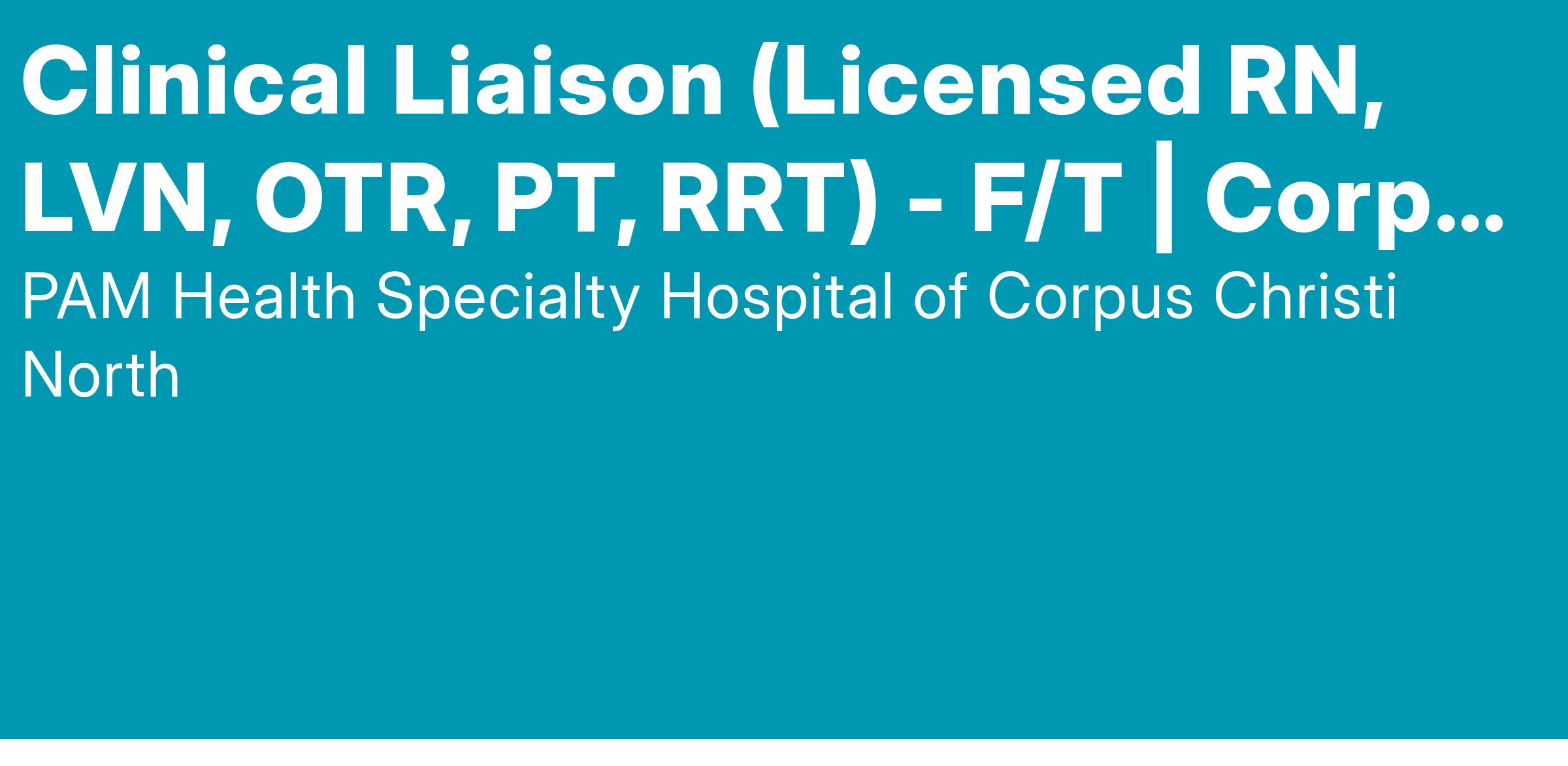 **Quality applicants will have a current license in one of the following: RN, LVN, OTR, PT, RRT or SLP with a minimum of 2 years experience in the designated field of license, preferably with rehabilitation/LTACH; We will consider substituting clinical experience for candidates possessing a robust background in healthcare sales, specifically within hospitals in the Corpus Christi market. Ideal candidates should have a minimum of five years of experience, along with medical knowledge and established networking relationships.