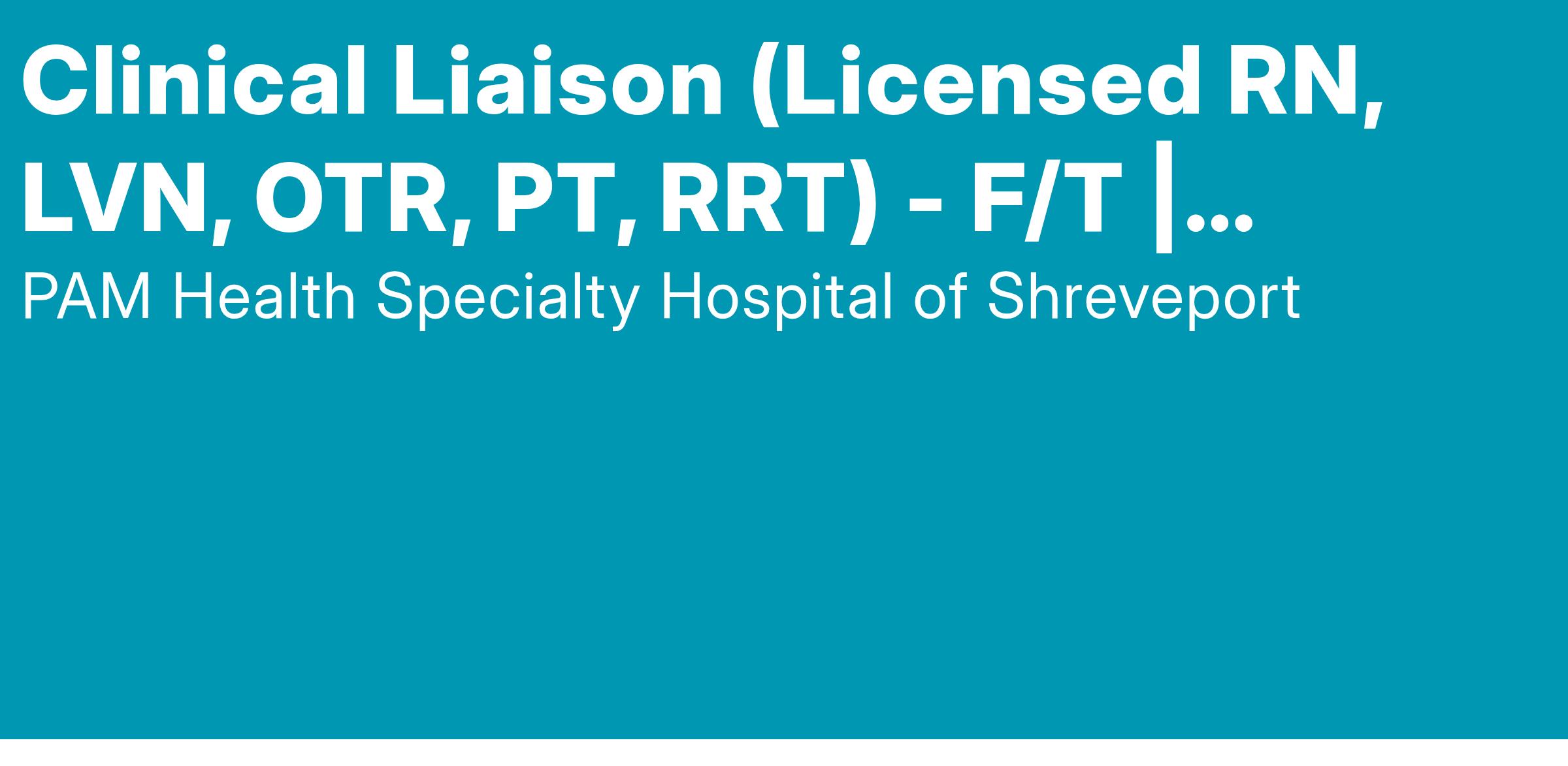 **Quality applicants will have a current license in one of the following: RN, OTR, PT, RRT or SLP with a minimum of 2 years experience in the designated field of license, preferably with rehabilitation/LTACH; We will consider substituting clinical experience for candidates possessing a robust background in healthcare sales, specifically within hospitals in the Shreveport market. Ideal candidates should have a minimum of five years of experience, along with medical knowledge and established networking relationships.