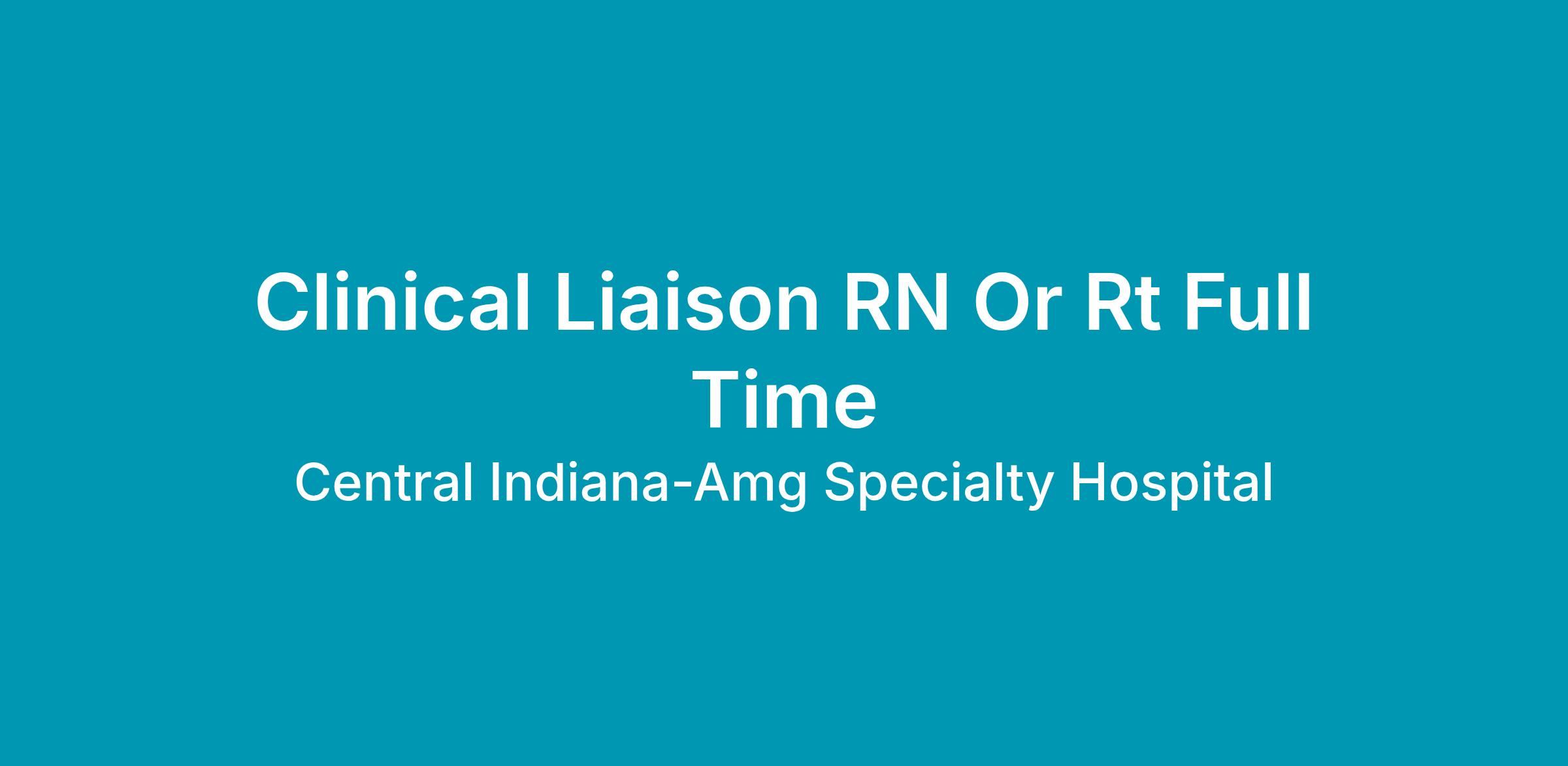 AMG Specialty Hospital - Muncie Campus seeks a Clinical Liaison (RN or RT). This Clinical Liaison will work with other Clinical/Community Liaisons, Administrators, Admission Coordinators, and the Corporate Team to help consistently increase patient census in the hospital. The average census of the hospital provides a "group performance indicator for the CL team" and the Admit-Referral report provides a "specific performance indicator for the individual CL." There are two basic parts to the CL role: evaluate the patient and educate the medical community. This position includes driving daily to and from meetings, referral sources and potential referral sources. Clinical experience is required as a Registered Nurse, RN, or Respiratory Therapist, RT.