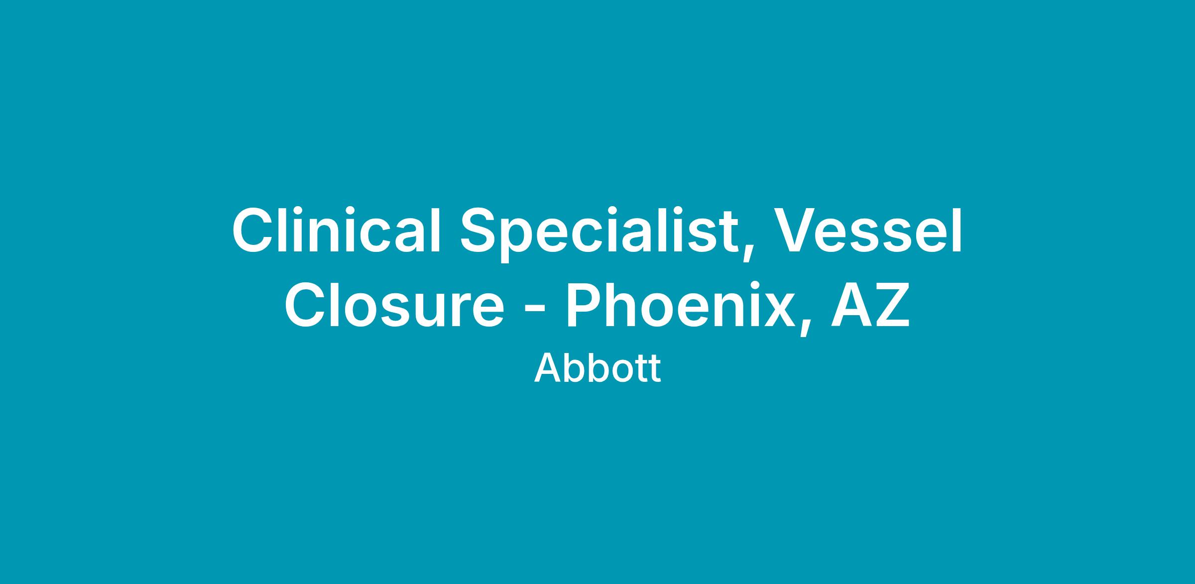 We currently have an opportunity for a Clinical Specialist, Vessel Closure, in Phoenix, AZ. The Clinical Specialist will primarily be responsible for case planning, case support coverage, and product pull- through throughout the designated territory, and throughout the Region as needed. The Clinical Specialist will promote Vascular products through education, service and training of customers in the hospital setting. The Clinical Specialist will provide clinical education and sales support in order to assist in achieving projected sales goals, increasing sales revenues within assigned product lines, and increasing market share. This position will have a heavy focus on Vessel Closure.