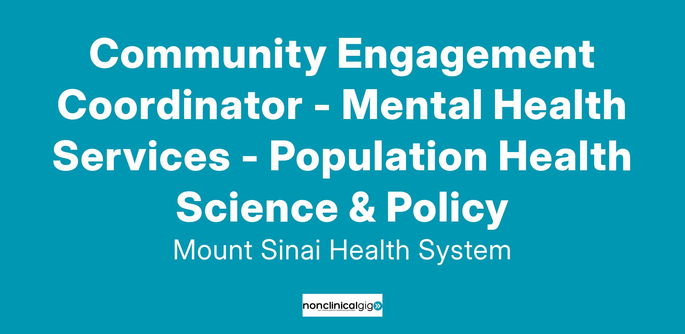 The Community Engagement Coordinator within the Icahn School of Medicine at Mount Sinai will conduct clerical, administrative and research activities mainly taking place in community-based settings. Working closely with the Program Manager, the Coordinator will support ongoing mental health initiatives and research programs, primarily the HOPE Center/ISSM Partnership and the Brothers=Connect and Haven=C.onnect initiatives