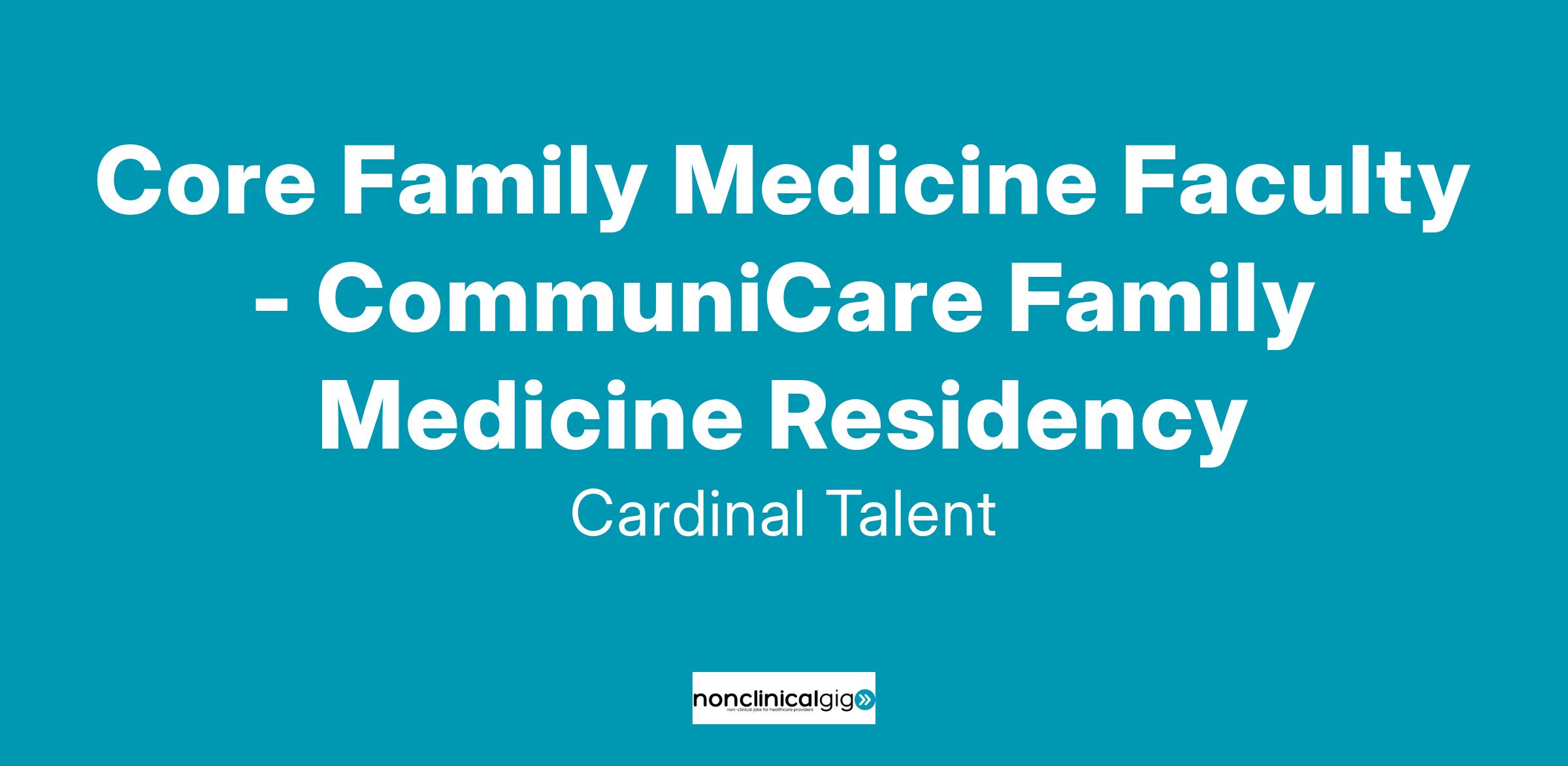 The University of the Incarnate Word School of Osteopathic Medicine ( UIWSOM ) educates aspiring physicians to be justice-minded, global citizens using a community-based, distributed model of education, which fosters inclusion, discovery and innovation. The UIWSOM Office of Graduate Medical Education and the Texas Institute for Graduate Medical Education and Research ( TIGMER ) has partnered with CommuniCare Health Centers and Baptist Health System in the development of a family medicine residency which is now in its second year of operation. The UIWSOM invites applications for a Board-Certified family physician to become a core clinical faculty member. This will be a part-time position 0.5 full time equivalent ( FTE ) for teaching, administration, scholarly activity, and development of the residency program. It is expected that the applicant will be employed by CommuniCare Community Health Center for the remaining 0.5 FTE for clinical practice and to supervise residents at the continuity clinic. Together, both the academic and the clinical component will create a full-time position. The successful applicant must be acceptable to both UIWSOM and CommuniCare in order to be hired. This position will be a 0.5 FTE position with the requirement that the faculty member must also maintain employment with CommuniCare Community Health Center. Continued employment with the UIWSOM is contingent upon continued employment with CommuniCare Community Health. UIWSOM is seeking a family medicine faculty physician to work closely with the Office of Graduate Medical Education and affiliated clinical sites to continue the development of the new residency program. The successful applicant will work with the program director to direct the development of curriculum and rotations and ensure compliance with accrediting bodies. The core faculty provide support for the program director to ensure the quality of the educational experience for the residents. The core faculty are the expert competency evaluators who work closely with the program director and associate program directors, who assist in developing and implementing the evaluation system, and who teach and advise residents. The core faculty report to the program director and the UIWSOM Associate Dean for Graduate Medical Education. The core faculty will operate within the UIWSOM framework of lifelong learning through collaborative scholarship, innovative educational excellence and learner-centered curricula.