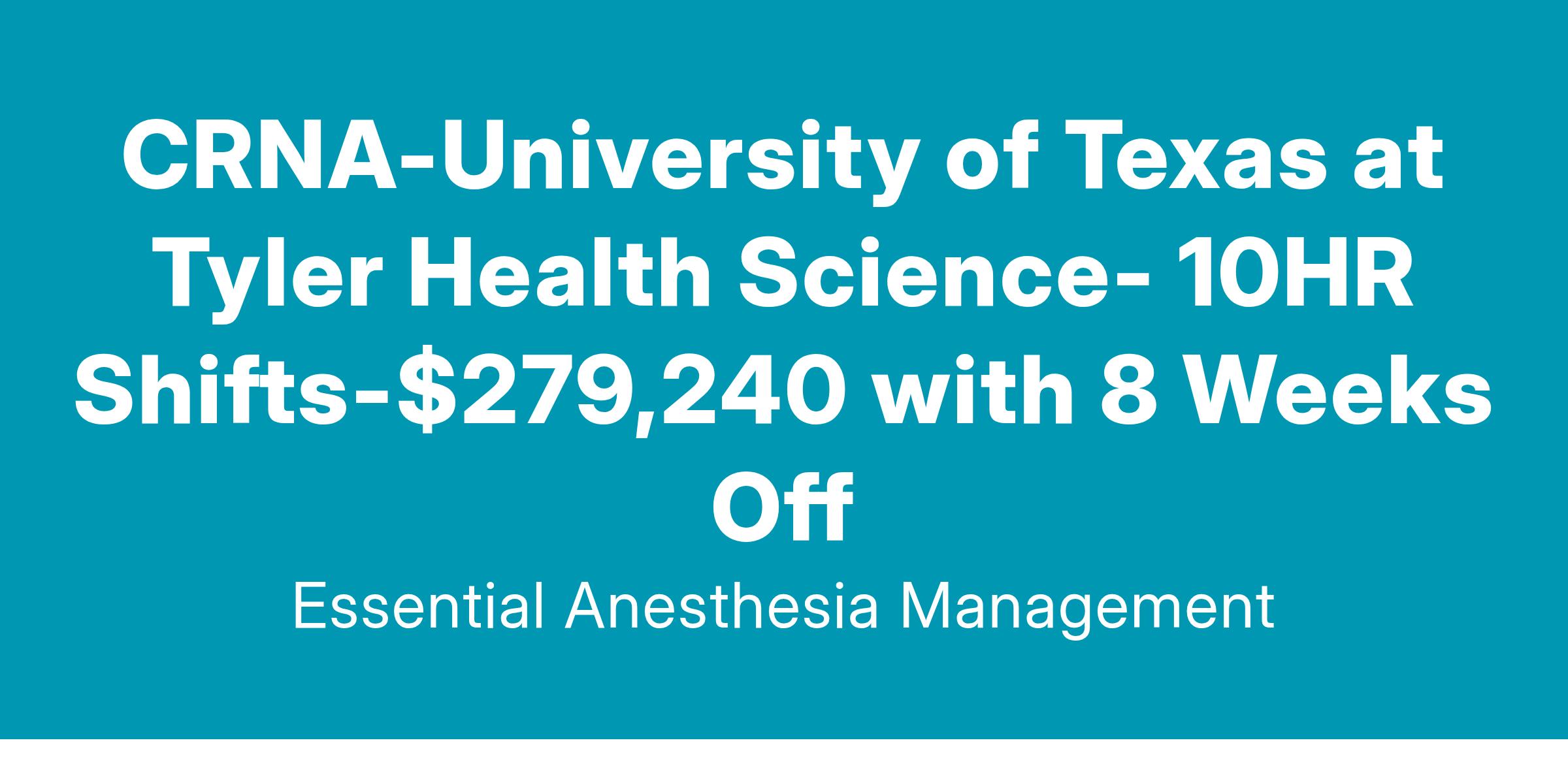 CRNA-University of Texas at Tyler Health Science- 10HR Shifts-$279,240 with 8 Weeks Off