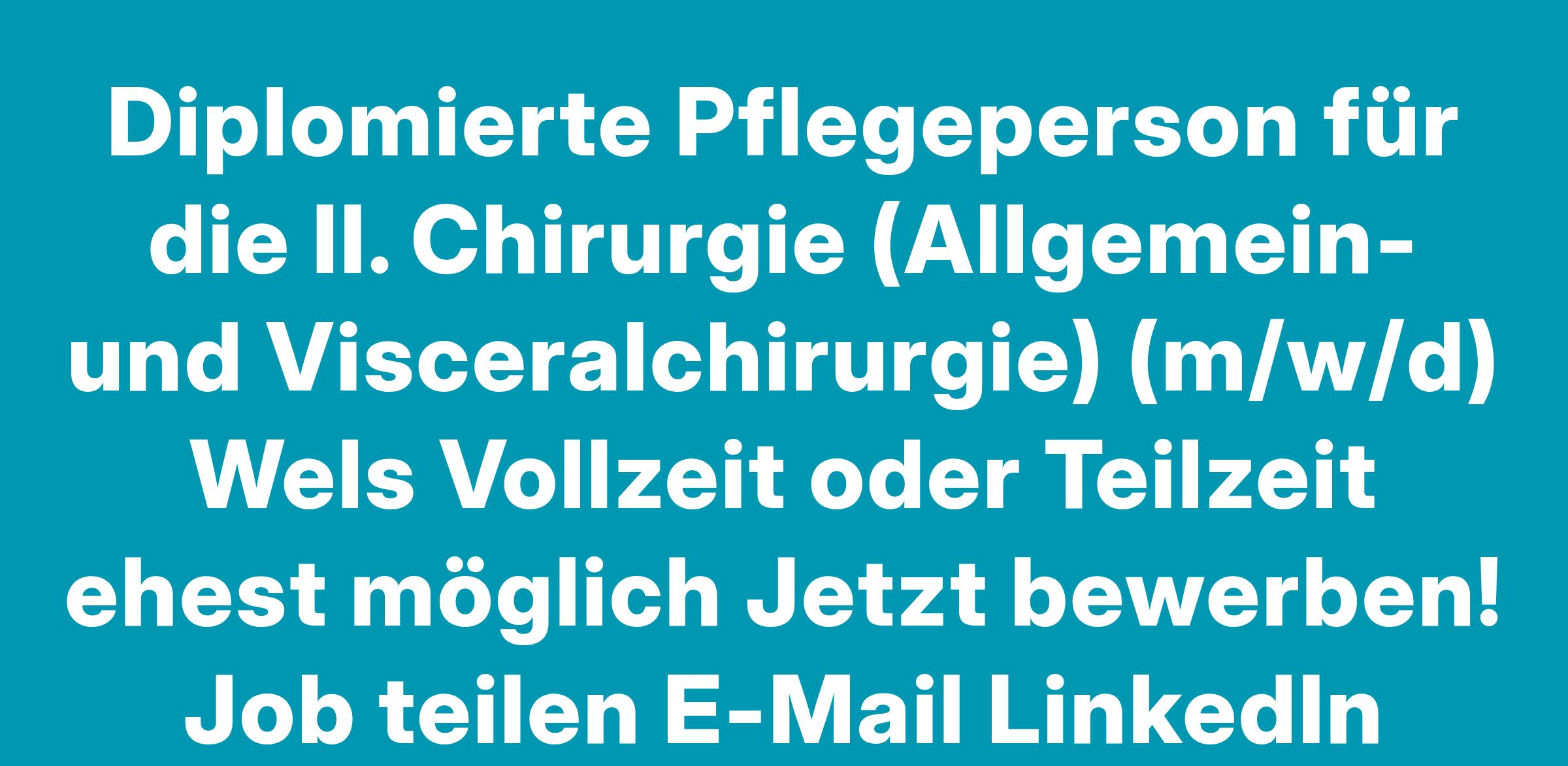 Diplomierte Pflegeperson für die II. Chirurgie (Allgemein- und Visceralchirurgie) (m/w/d) Wels Vollzeit oder Teilzeit ehest möglich Jetzt bewerben! Job teilen E-Mail LinkedIn Facebook Xing Whatsapp Jobs am Klinikum Wels-Grieskirchen haben Zukunftspotential. Die hohe Fachkompetenz unserer Mitarbeiter sowie der offene, ehrliche und sehr persönliche Umgang miteinander bilden die Grundlage für medizinische Top-Versorgung. Das spüren Mitarbeiter wie Patienten des größten Ordensspitals Österreichs tag