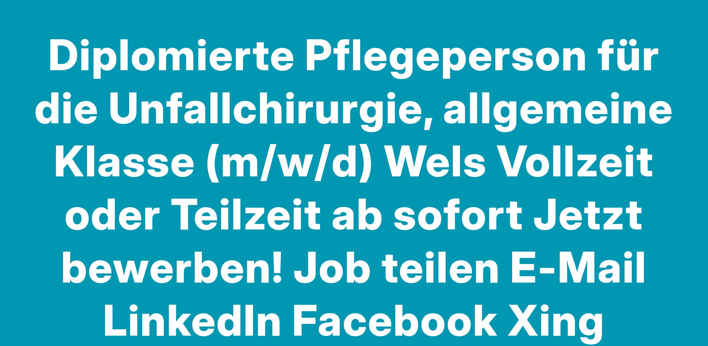 Diplomierte Pflegeperson für die Unfallchirurgie, allgemeine Klasse (m/w/d) Wels Vollzeit oder Teilzeit ab sofort Jetzt bewerben! Job teilen E-Mail LinkedIn Facebook Xing Whatsapp Jobs am Klinikum Wels-Grieskirchen haben Zukunftspotential. Die hohe Fachkompetenz unserer Mitarbeiter sowie der offene, ehrliche und sehr persönliche Umgang miteinander bilden die Grundlage für medizinische Top-Versorgung. Das spüren Mitarbeiter wie Patienten des größten Ordensspitals Österreichs tagtäglich. Jetzt bew