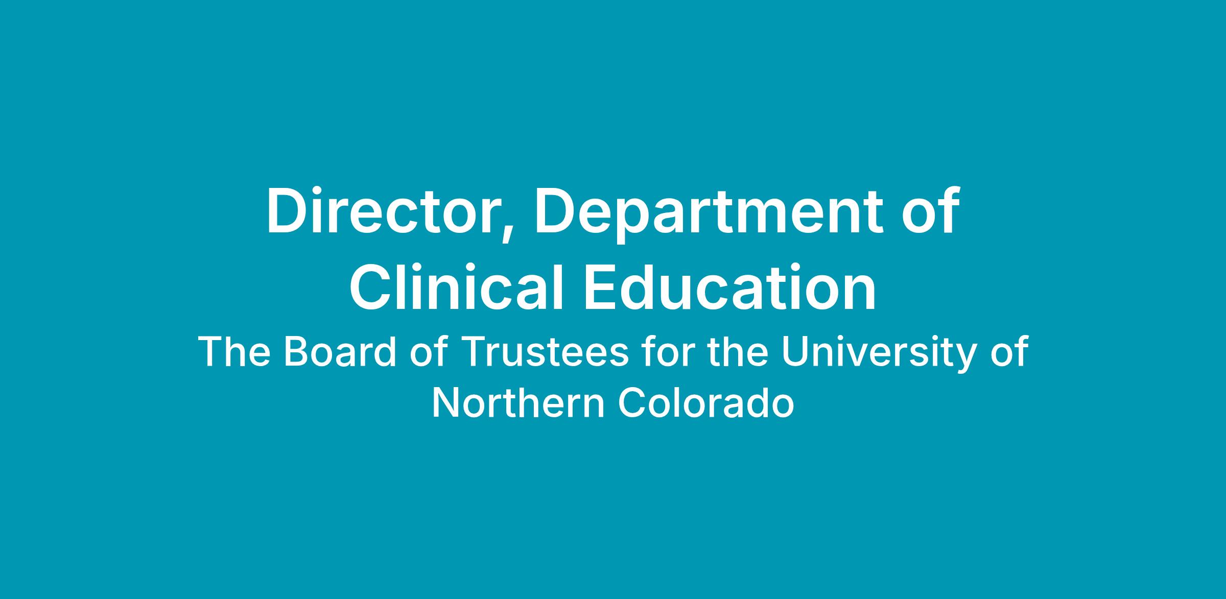 The Director of the Department of Clinical Education will assist in the planning, coordination and leadership of all aspects of the clinical education program at UNC COM. This position requires significant organizational and leadership skills. as they oversee departmental operations, including clinical rotation coordination, supervision of personnel, and budgetary management. Excellent interpersonal skills are also required as this individual is responsible for the establishment and maintenance of strong relationships with leadership and staff at hospital and clinic facilities as well as physician preceptors and medical students. This position is responsible for generating and maintaining letters of intent and affiliation agreements with physician preceptors and their host agencies and works with the University of Northern Colorado central contract and legal systems to obtain these documents. The director of the department of clinical education also supports students in the acquisition of housing for those clinical rotations out of region, when necessary.