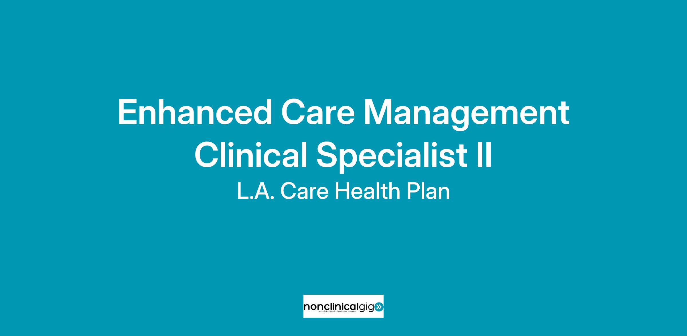 The Enhanced Care Management (ECM) Clinical Specialist II is responsible for the management and oversight activities associated with L.A. Care's ECM network. The position reports to the Supervisor of ECM and receives clinical supervision as needed from the Medical Director of Care Management. The position is responsible for providing oversight, feedback, and technical assistance to ECM Providers to support effective delivery of ECM services and ensure compliance with local, State, and Federal regulations, statues and guidelines. The position is responsible for conducting regular meetings with providers, reviewing Assessments & Care Plans, providing guidance on clinical best practices, and assisting with escalation of cases that require additional assistance from L.A. Care. The position works directly with Care Management and Provider Network Management staff to inform Provider capacity-building and training activities related to the ECM Program operations.