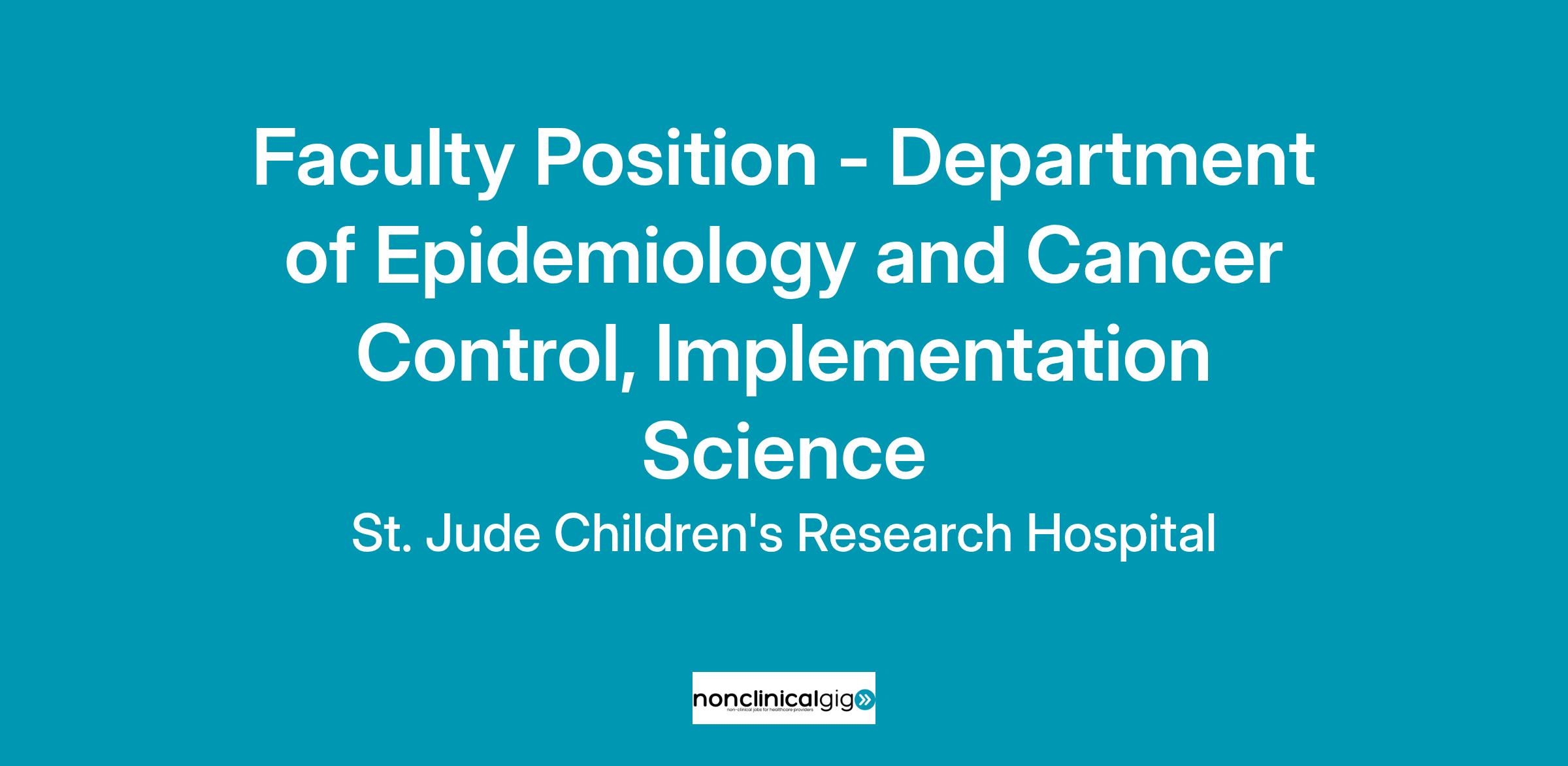 The Department of Epidemiology and Cancer Control at St. Jude Children’s Research Hospital is recruiting Faculty Members at the FULL, ASSOCIATE or ASSISTANT level as we expand our Department’s mission to conduct implementation science research to complement a well-established research program consisting of highly innovative clinical, biological, and population-health sciences research (both observational and interventional studies) among survivors of childhood cancer. Further, we conduct research to translate our findings into effective strategies to avert or mitigate cancer-treatment-related complications and improve the quality of life of childhood cancer survivors in alignment with implementation science activities. We seek creative and collaborative scientists with specific expertise and experience in implementation science as we grow and further expand the mission.