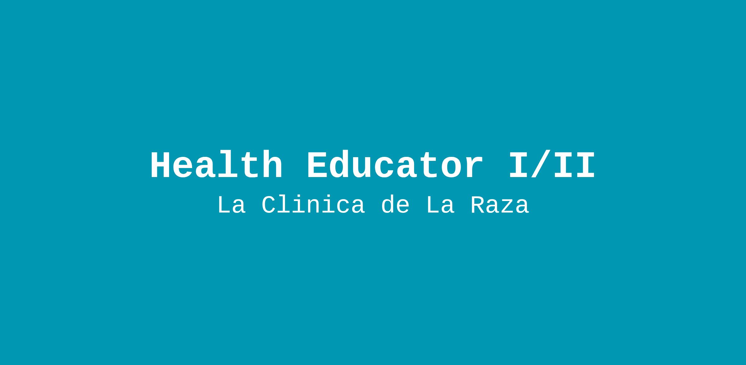 Be a wellness ambassador: At a time when our communities are responding to intensified challenges, it becomes more important than ever that those who can use their voice to educate and activate others to step forward. La Cl�nica was founded over 45 years ago by activists who saw the need for high quality culturally appropriate healthcare for Latinos in the Fruitvale area. As a Health Educator at La Cl�nica, you will build upon our strong legacy, serving an ever more diverse population, and working shoulder to shoulder with some of the most dedicated community educators you'll meet. Maybe you already know the power of community education to transform because you've seen it in your own life. Maybe community healthcare, like the care we offer at La Cl�nica, made it possible for you to have medical care growing up. If you are passionate about transforming our communities into healthy and empowered spaces, La Cl�nica is the place for you. We are seeking Health Educators who have discovered the power of their voice, who get activated when they're teaching and sharing information with others, and who are passionate about wellness. Yes, you will work hard at La Cl�nica, but the sense of teamwork, and our dedication to giving our diverse community the high-quality services they deserve, will inspire you to do amazing work.