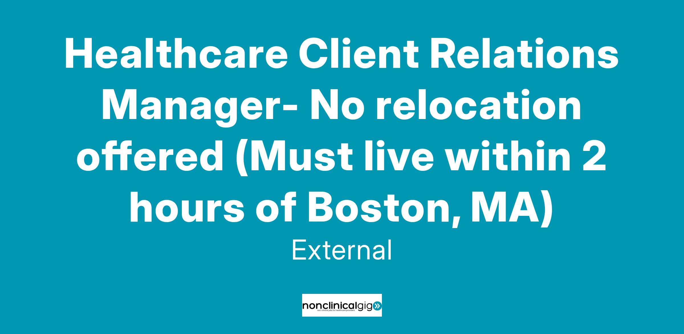 The Healthcare Client Relations Manager Must live within 2 hours of Boston, MA. As a Healthcare Client Relations Manager, you will oversee the following: client relationship, meeting schedule, on-site visitation, and ensure that communications adhere to quality control guidelines. This also includes management of issues, risks and project change requests to ensure successful and on-time project delivery. Contribute to process improvement initiatives as it relates to improving client efficiencies, to increase service value.