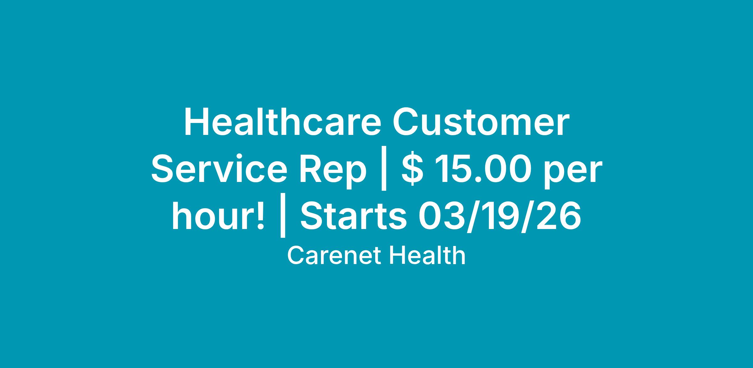 At Carenet Health, we value the expertise and dedication of our team members, and we are committed to offering an appealing compensation package. The wage for the Healthcare Customer Service Rep is $15.00 per hour.