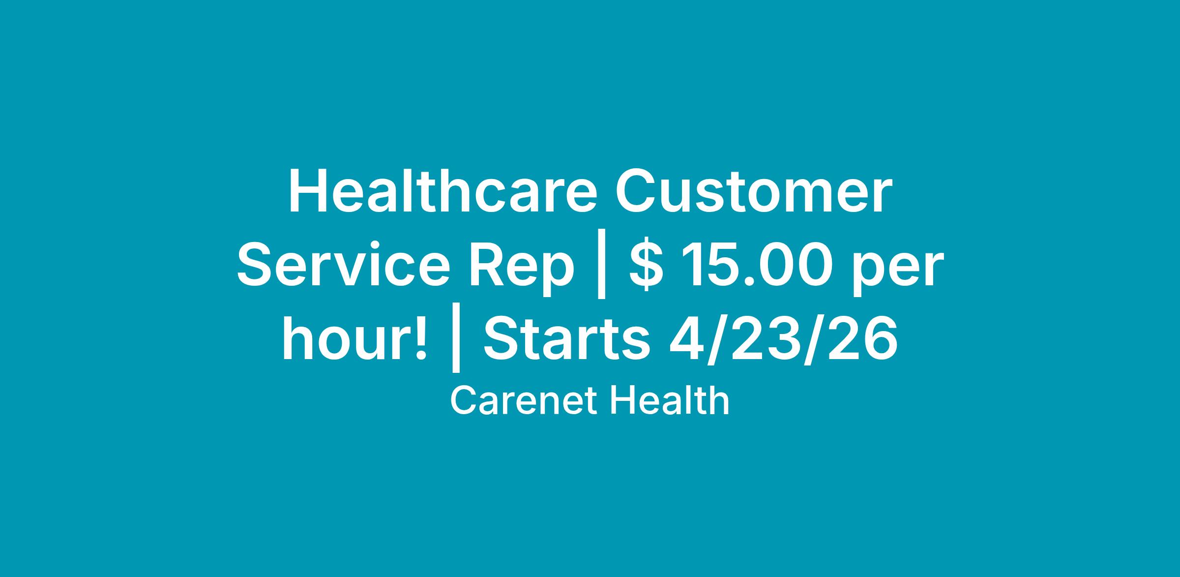 At Carenet Health, we value the expertise and dedication of our team members, and we are committed to offering an appealing compensation package. The wage for the Healthcare Customer Service Rep is $15.00 per hour.