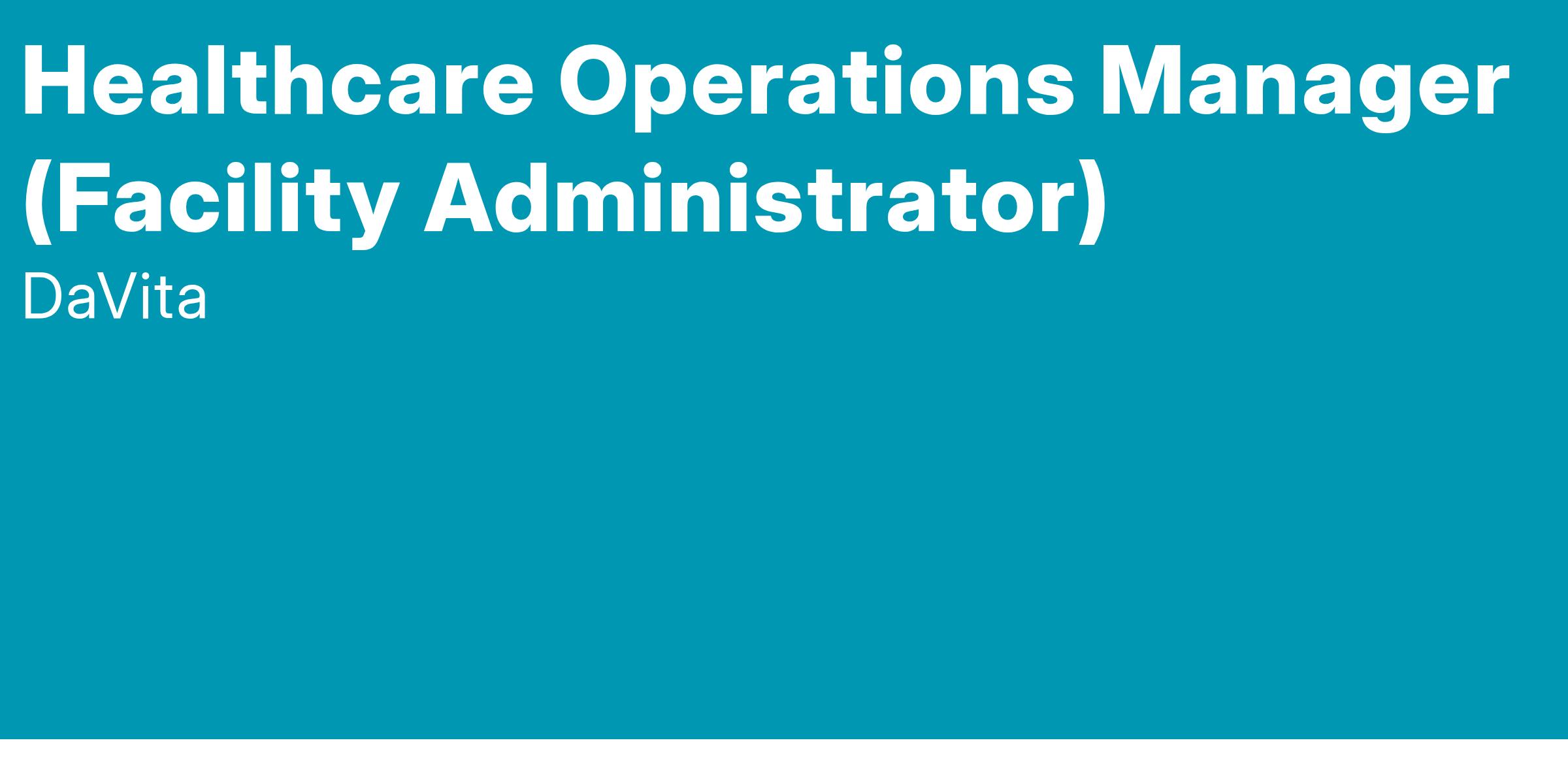 DaVita has an open position for a Healthcare Operations Manager (Facility Administrator) who must be an ambitious, operationally-focused and results-driven leader. You will directly impact patient care as the trusted front-line leader in an outpatient clinic setting. Health care experience is not required!