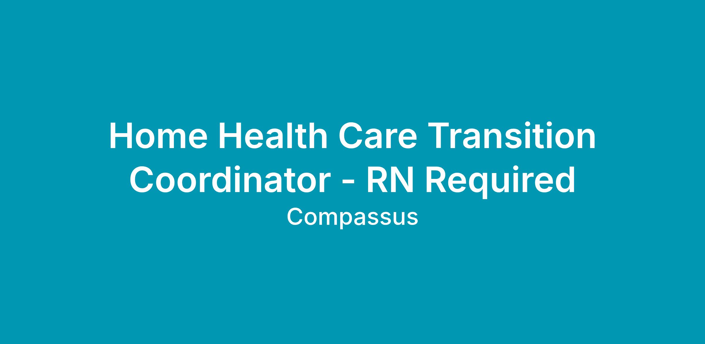 The Home Health Care Transition Coordinator is responsible for modeling the Compassus values of Compassion, Integrity, Excellence, Teamwork, and Innovation and for promoting the Compassus philosophy, using the 6 Pillars of Success as the foundation. S/he is responsible for upholding the Code of Ethical Conduct and for promoting positive working relationships within the company, among all departments, and all external stakeholders. The Home Health Care Transition Coordinator serves as a trusted resource for the physician and hospital case managers and communicates with referral sources. S/he conducts skilled conversations with physicians, patients, families, and healthcare providers. S/he maintains an understanding of hospital and post-acute healthcare systems. The Home Health Care Transition Coordinator navigates getting patients into the right care at the right time.