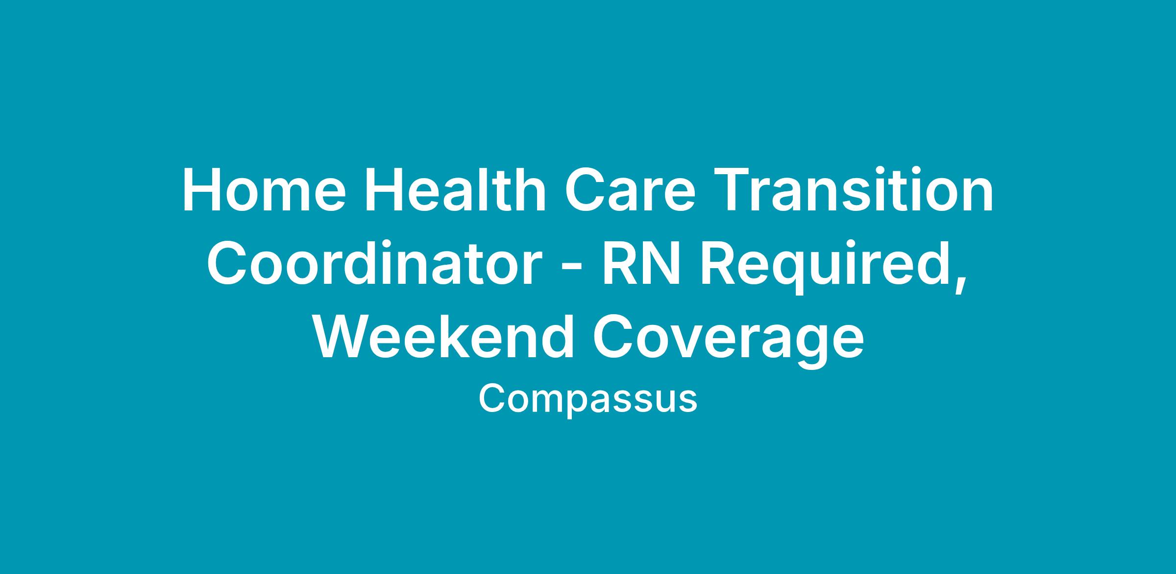 The Home Health Care Transition Coordinator is responsible for modeling the Compassus values of Compassion, Integrity, Excellence, Teamwork, and Innovation and for promoting the Compassus philosophy, using the 6 Pillars of Success as the foundation. S/he is responsible for upholding the Code of Ethical Conduct and for promoting positive working relationships within the company, among all departments, and all external stakeholders. The Home Health Care Transition Coordinator serves as a trusted resource for the physician and hospital case managers and communicates with referral sources. S/he conducts skilled conversations with physicians, patients, families, and healthcare providers. S/he maintains an understanding of hospital and post-acute healthcare systems. The Home Health Care Transition Coordinator navigates getting patients into the right care at the right time.