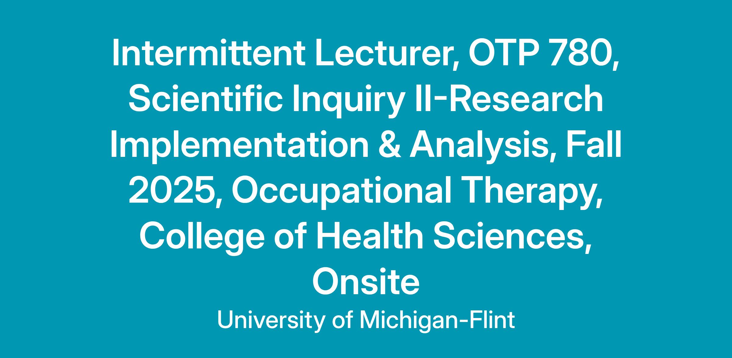 This course, OTP 780, includes the continuation of research process implementation used in Occupational Therpy clinical research. It focus on methodology, data collection and analysis as well as teh interpretation of qualitative and quantitative research. This course meets on Thursday, 3:00 p.m. - 5:00 p.m in the William S White Building, August 2025 through December 2025.