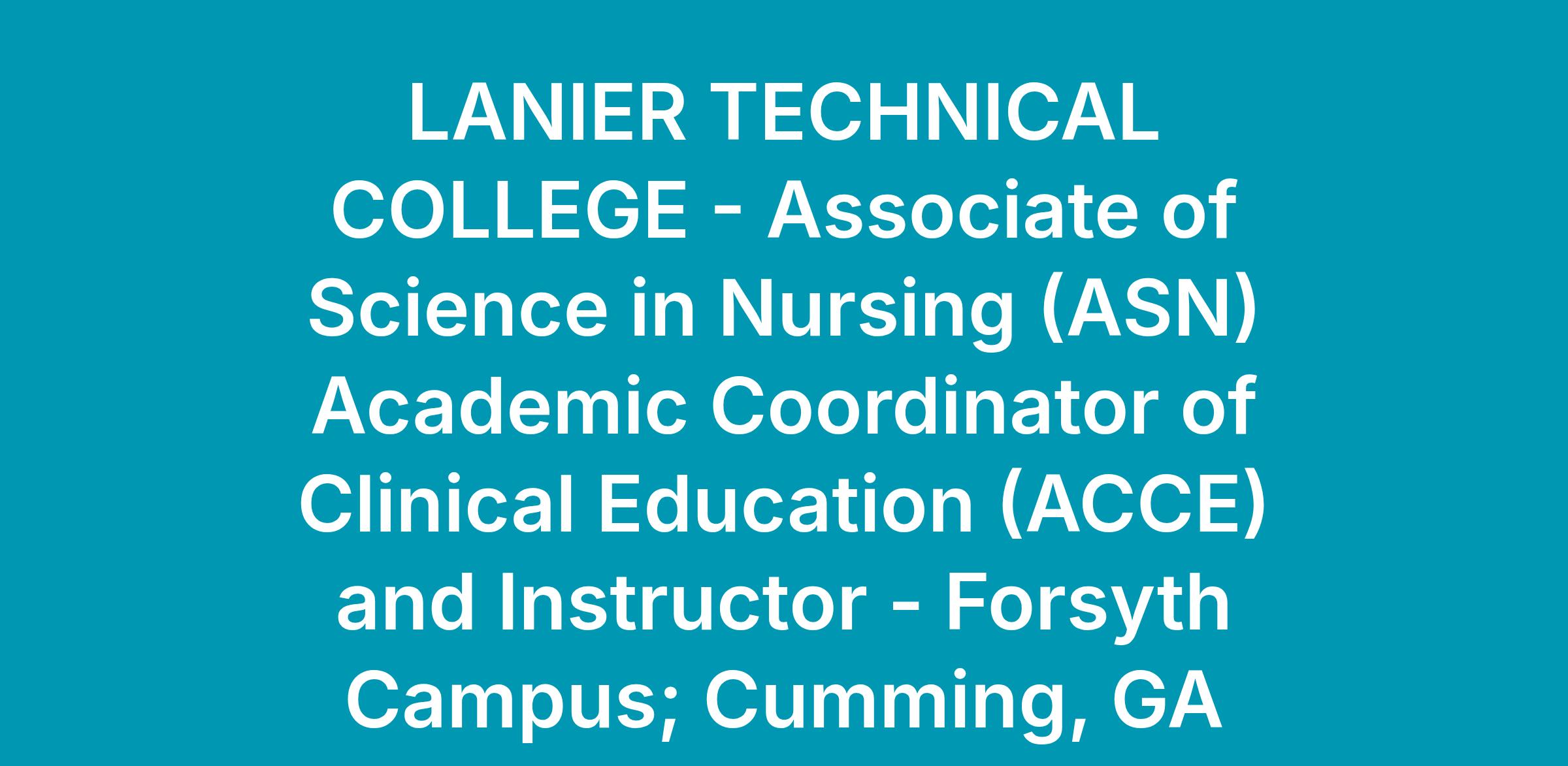 Lanier Technical College – Forsyth Campus; Cumming, GA - www.laniertech.edu is conducting a search for the following grant-funded, full-time, benefit-eligible, salaried position. NOTE: A background and reference check are part of the selection process. Also, a post-hire, clinical-site specific background check and 11 panel drug-screen may be required so faculty members can assist our students at clinical sites. Please contact Human Resources at 770-533-6903 or cantrell@laniertech.edu if any assistance/accommodation is needed in the application/interview process.