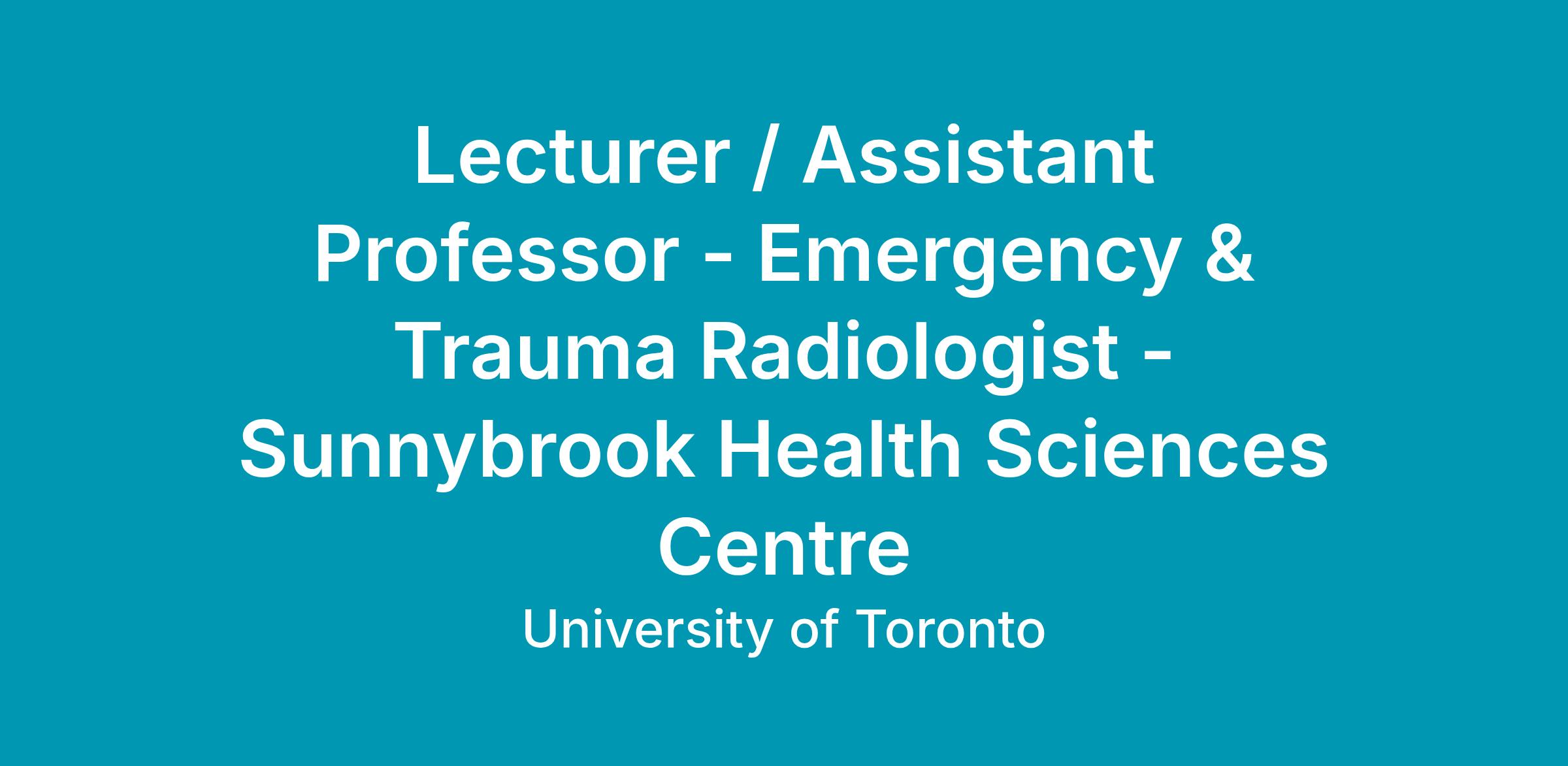 The qualified applicant should be eligible for an academic appointment at the rank of Lecturer or Assistant Professor at the University of Toronto, hold a Fellowship in Diagnostic Imaging from the Royal College of Physicians and Surgeons of Canada or international equivalent, and be eligible for medical licensure with the College of Physicians and Surgeons of Ontario, with sufficient experience to perform subspecialty work in Emergency and Trauma Imaging. A year of dedicated fellowship training in Emergency and Trauma Radiology post-residency graduation is essential.