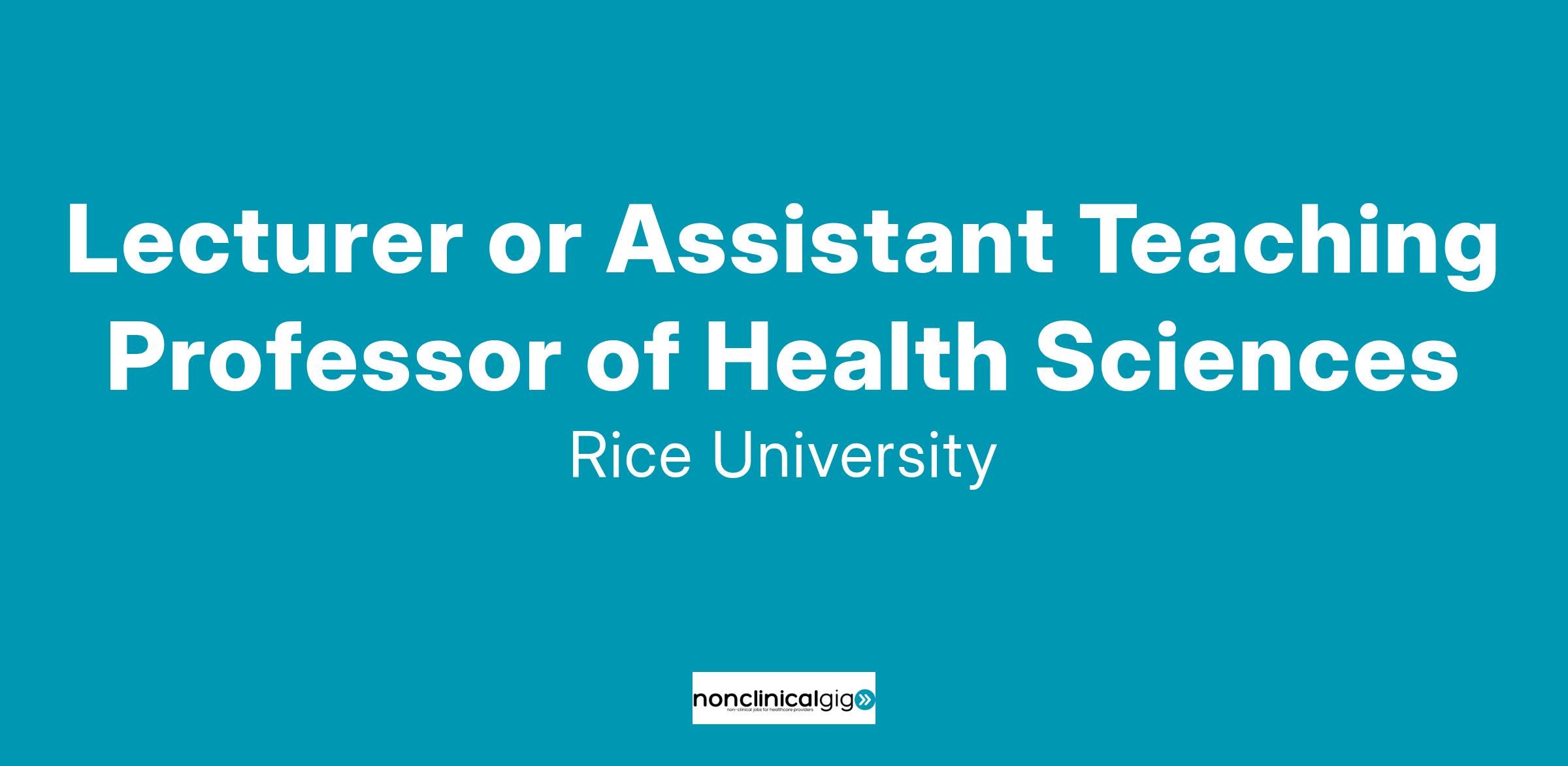 The Department of Kinesiology at Rice University in Houston, TX invites applications for a full-time faculty member at the rank of Lecturer or Assistant Teaching Professor in Health Sciences, to start as early as the 2025 fall semester. We seek candidates who can teach undergraduate courses in the Health Sciences (public health) curriculum, including health promotion, epidemiology, environmental health, and/or health policy. Academic specialization in epidemiology, environmental health, or health policy is highly desirable. Service duties include student mentoring and advising, as well as participation in department, school, and university committees.