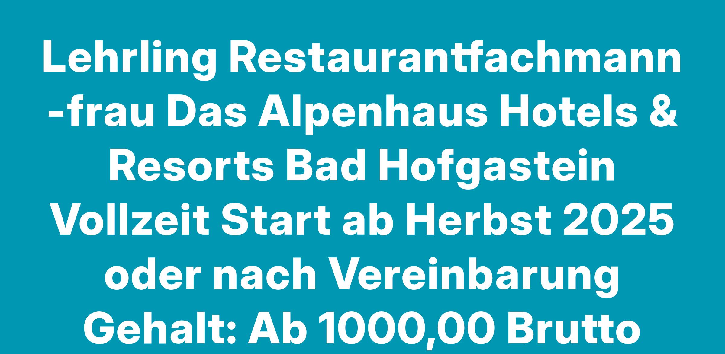 Lehrling Restaurantfachmann -frau Das Alpenhaus Hotels & Resorts Bad Hofgastein Vollzeit Start ab Herbst 2025 oder nach Vereinbarung Gehalt: Ab 1000,00 Brutto (+200,00 netto Lehrlingsbonus möglich) pro Monat