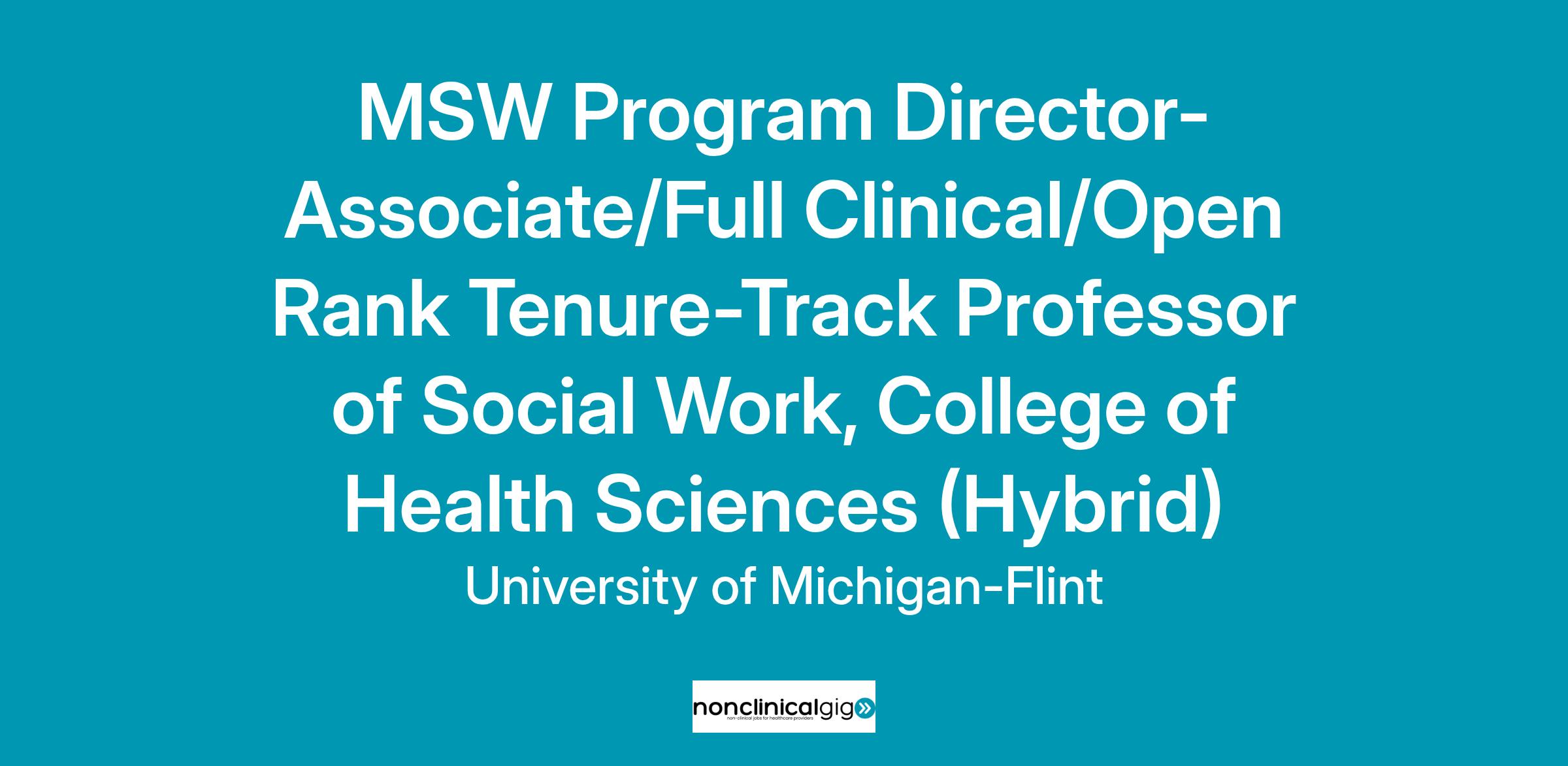 Be at the forefront of change and become a part of the innovative and forward-thinking academic team at the University of Michigan-Flint’s Social Work Department in the rapidly expanding College of Health Sciences! The Social Work Department is searching for a Program Director for its MSW program. The program is currently in CSWE pre-candidacy status. Initial Accreditation decision is expected in June 2027. This is a full-time Associate or Full clinical-track professor appointment or an open rank tenure-track faculty position with 50% assigned time to administer the MSW program. This position is 50% instructional and 50% administrative. This hybrid position requires a regular presence on campus. We seek to hire faculty whose scholarship and clinical expertise focus on clinical social work, mental and behavorial health practice, and social work practice in health care settings. The desired start date is August 2025 for tenure-track (9 months) appointment or Spring 2025 for a clinical track (12 months) appointment.