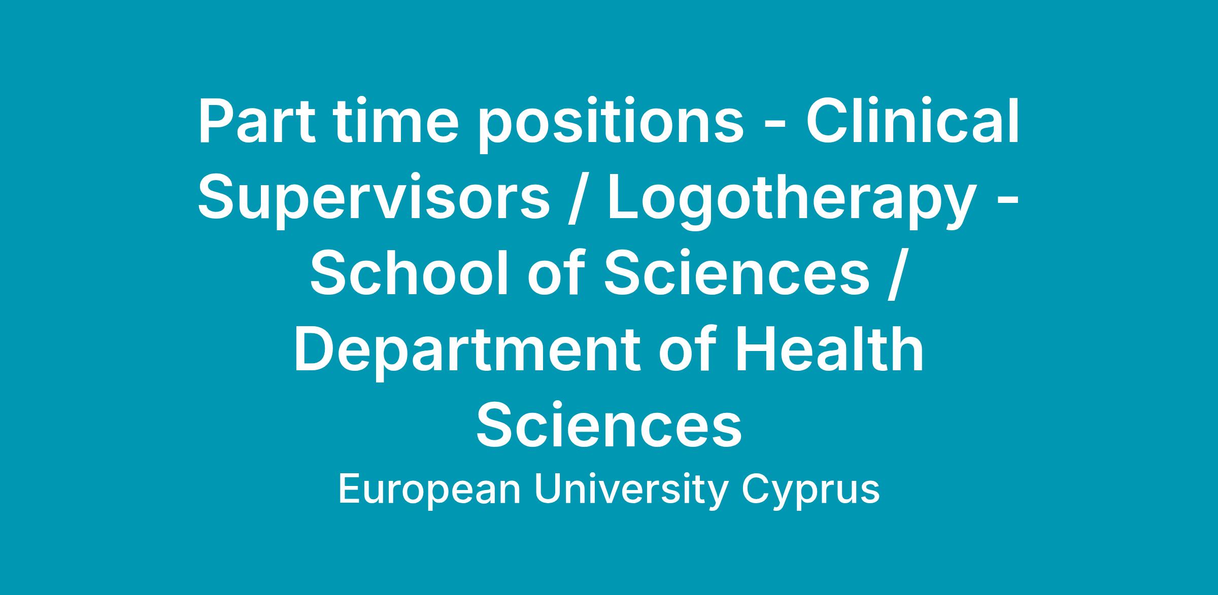 Το Ευρωπαϊκό Πανεπιστήμιο Κύπρου η Σχολή Θετικών Επιστημών προκηρύσσει θέσεις μερικής απασχόλησης για Κλινικούς Επόπτες Λογοθεραπείας, στην Κλινική Λόγου, Ομιλίας και Ακοής για επίβλεψη της κλινικής άσκησης των φοιτητών.