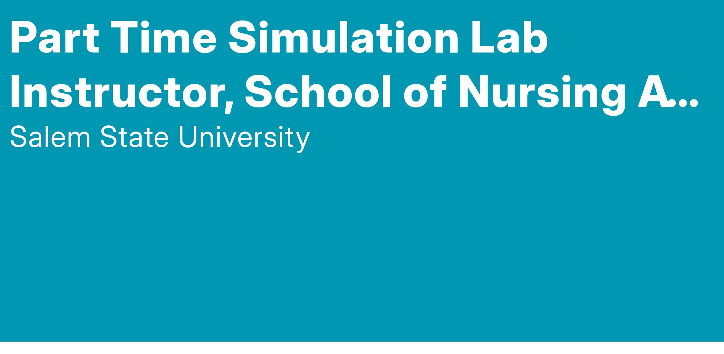 Salem State University is seeking SIM lab instructors with interest and experience teaching clinical nursing in the simulation/skills laboratories in the undergraduate nursing program. The RN Lab Instructor for the Nursing Skills Lab will supervise clinical skill acquisition and remediation for nursing majors. This will include demonstration of skills, instruction and evaluation of competencies, and use of simulation equipment to enhance student learning.