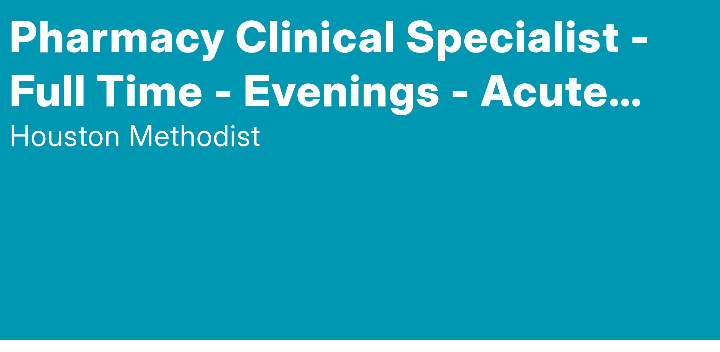 At Houston Methodist, the Pharmacy Clinical Specialist position is responsible for performing advanced clinical pharmacy duties enabling the delivery of optimal pharmacotherapy to patients and facilitating safe, efficacious, and pharmacoeconomically rational use of medications in the population(s) served. This position involves daily reactive and targeted proactive medication regimen reviews for patients within the designated area(s) of responsibility or populations served. The Pharmacy Clinical Specialist position supports the delivery of pharmacy managed protocols, formulary processes and medication reconciliation activities while providing education to fellow pharmacists, nurses, and medical staff. Additional duties for this position include precepting pharmacy students and pharmacy residents on clinical patient care rotations within areas of responsibility and contributing to fulfilling the organization's mission to provide innovative, personalized, cost-effective pharmaceutical care in a culture dedicated to quality and safety.