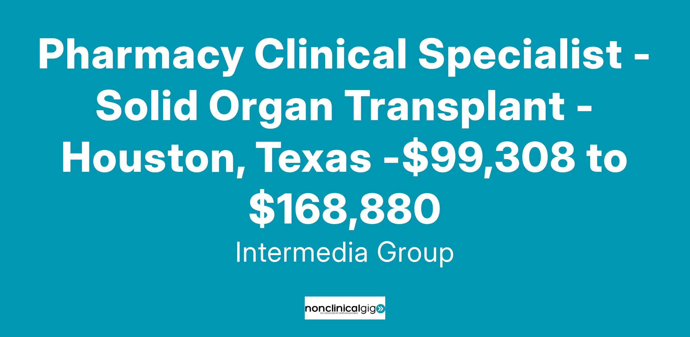 OPEN JOB: Pharmacy Clinical Specialist - Full Time - Days - Solid Organ Transplant LOCATION: Houston, Texas ***RELOCATION ASSISTANCE AVAILABLE SALARY: $99,308 to $168,880 FULL-TIME BENEFITS - Full