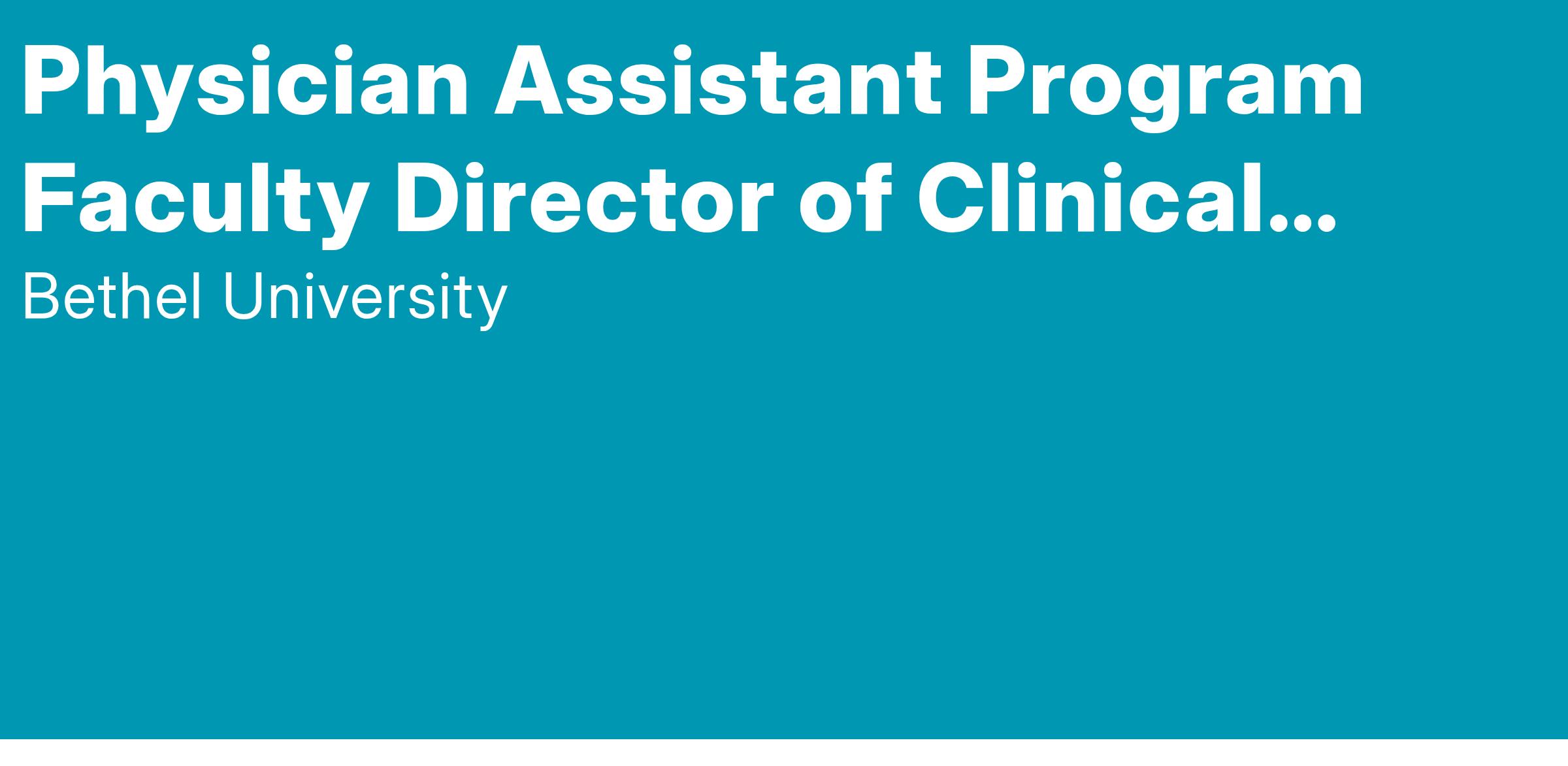 This faculty position is a full-time, in-person tenure track or clinical track role within the Bethel University Physician Assistant program. The Director of Clinical Education oversees the clinical education component of PA education and works closely with the Clinical Coordinator and clinical team. Areas of focus include student clinical rotation placement, recruitment/retention of clinical sites, clinical site visits and evaluations, and ensuring compliance with accreditation standards. Includes supporting and teaching students throughout their didactic and clinical education. This individual will work closely with the Program Director and collaborate closely with faculty, staff, preceptors, and affiliated healthcare institutions.