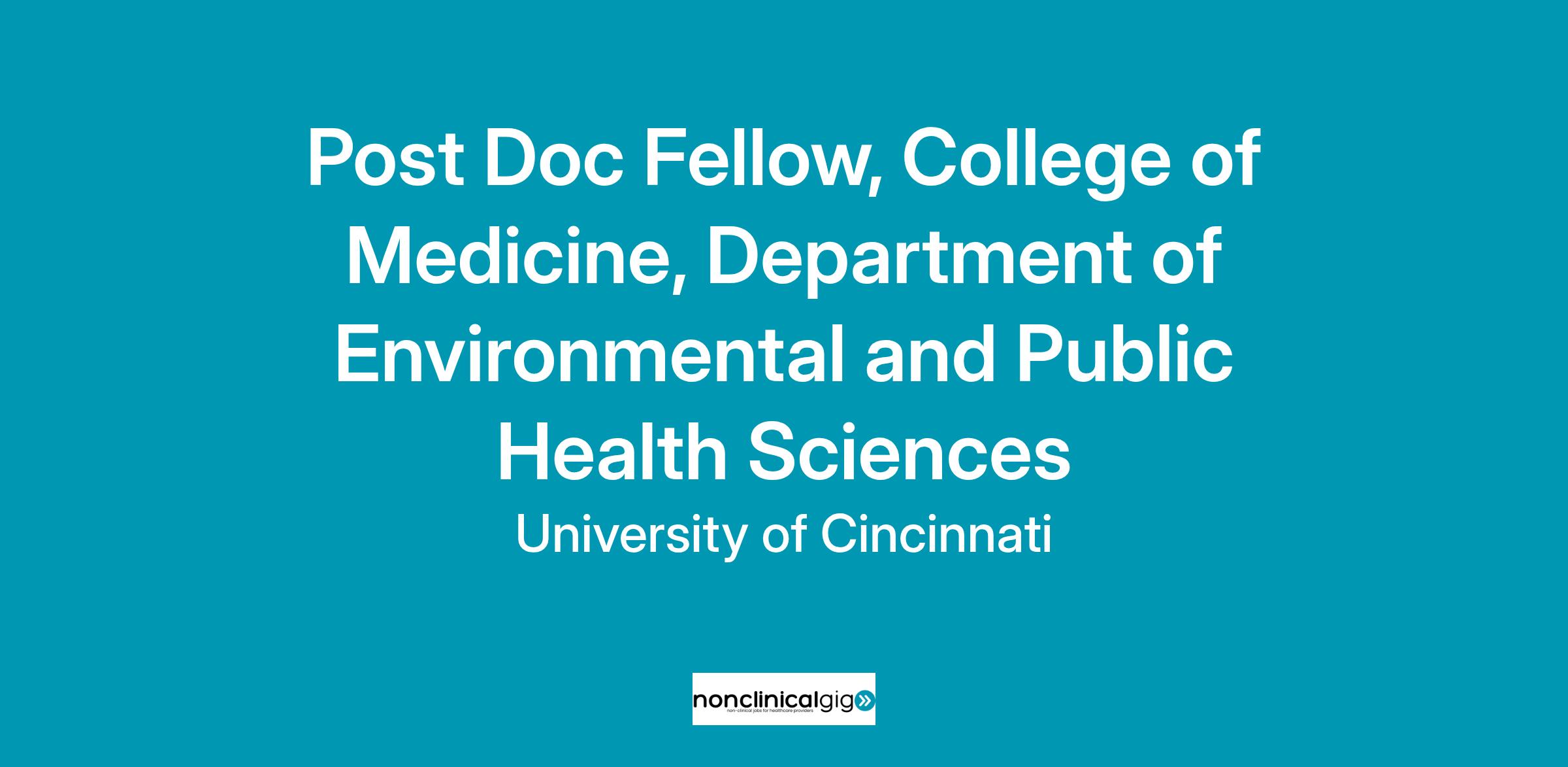 A full-time Post Doc Fellow position is available in the Department of Environmental and Public Health Sciences at the University of Cincinnati College of Medicine.
