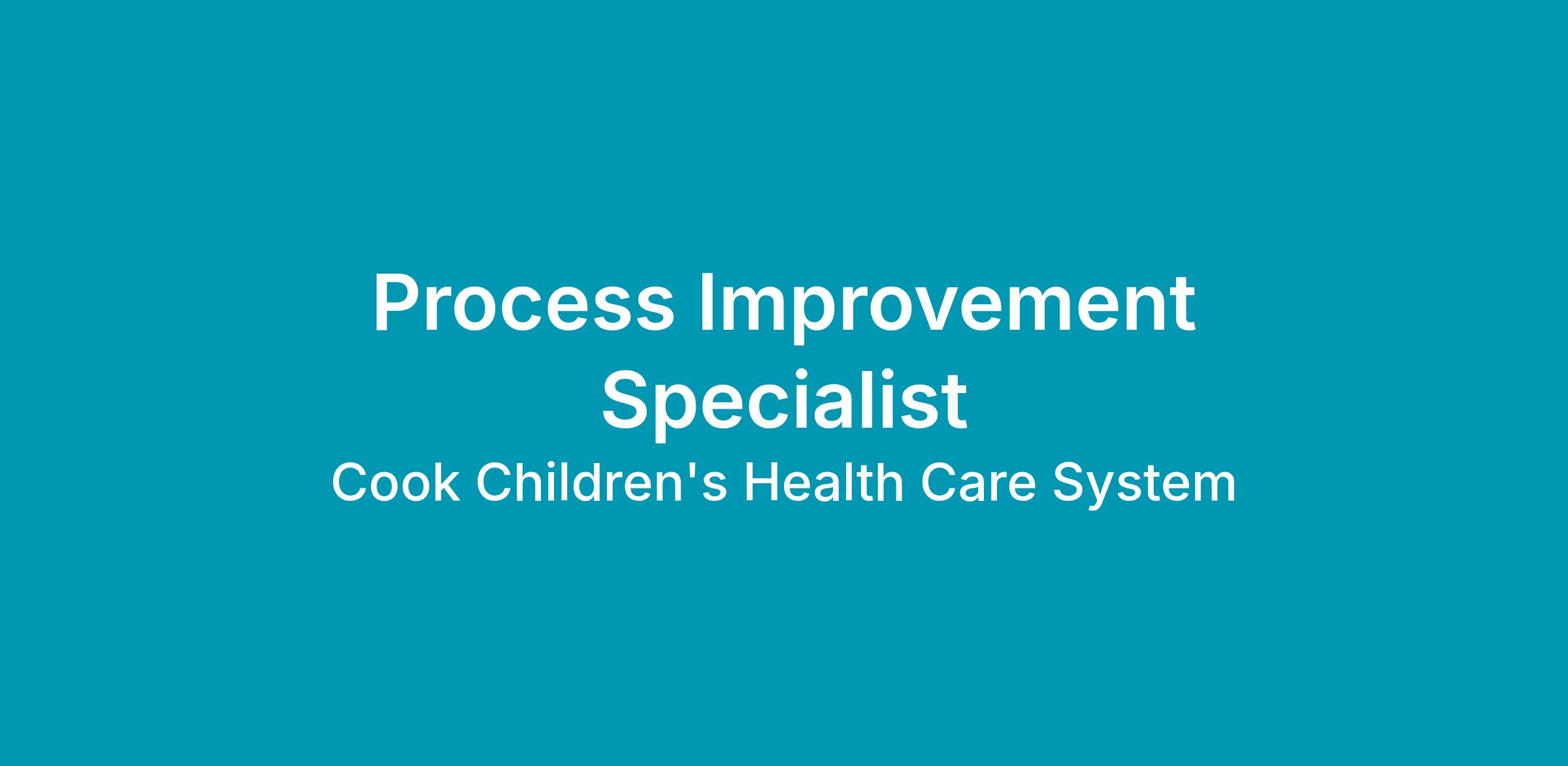 The Specialist works collaboratively with teams and department leaders throughout Cook Children Healthcare System to demonstrate our values and achieve βOur Promiseβ through the implementation of process improvement initiatives and programs. The Specialist acts as an organizational process improvement champion who leads departmental and cross-functional teams through all aspects of the continuous improvement effort using Lean, Six Sigma and other effective strategies and methodologies. The Specialist facilitates the identification, understanding and improvement of process issues by using appropriate quantitative and qualitative tools. The Specialist will assist with the development and delivery of process improvement training and education to the organization. As an agent of change, the specialist will serve as a catalyst to create a culture that continuously strives for operational excellence and embraces the principles of process improvement. This role is expected to obtain the applicable lean six sigma certification to perform the job functions.