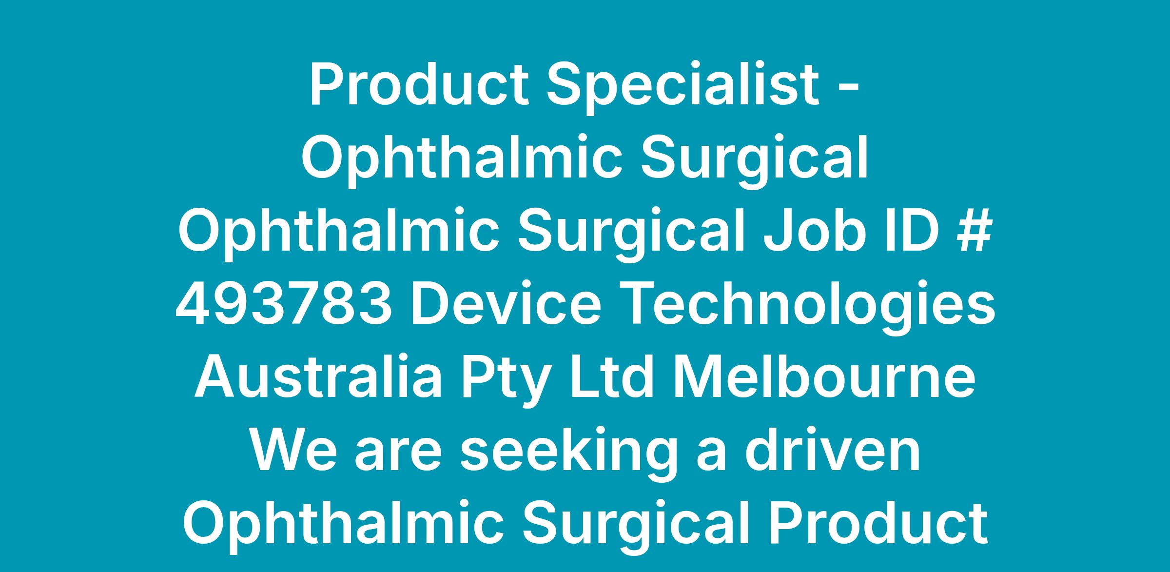 Product Specialist - Ophthalmic Surgical Ophthalmic Surgical Job ID # 493783 Device Technologies Australia Pty Ltd Melbourne We are seeking a driven Ophthalmic Surgical Product Specialist to lead sales of our proprietary product portfolio across the most dynamic areas of Ophthalmology. Representing innovative technology and specialised consumables, you’ll partner closely with clinicians in both Public and Private Hospital settings as well as Clinical support to Surgical Clinical Teams. This rol