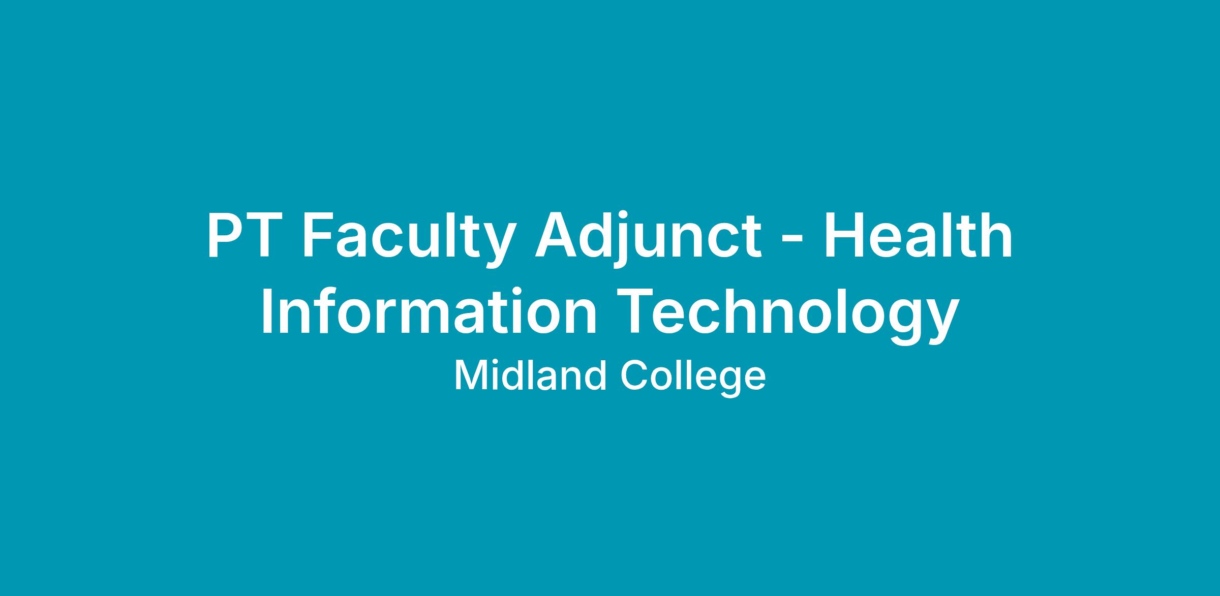 DescriptionThe adjunct faculty member in the Health Information Management program at Midland College is responsible for preparing and teaching assigned Health Information Management courses as needed. The adjunct faculty member contributes to student learning through effective teaching, timely feedback, and adherence to program, college, and accreditation standards.