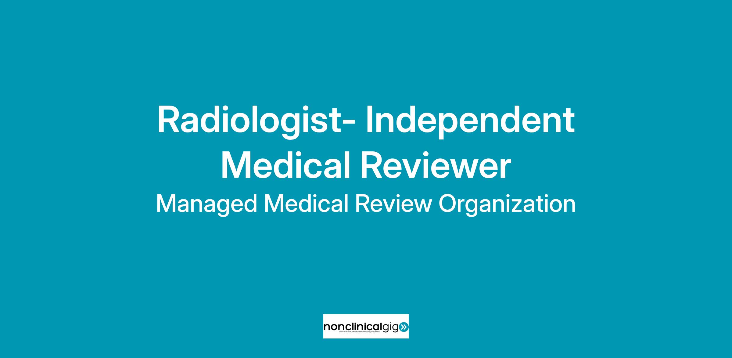 Position: Physician Reviewer – Radiologist Organization: Managed Medical Review Organization (MMRO) Employment Type: Independent Contractor (Remote) Managed Medical Review Organization (MMRO) is seeking Board-Certified Radiology Physicians to perform independent medical chart reviews. This is a subcontracted, remote opportunity offering flexibility and professional collaboration with an experienced clinical review team. Responsibilities: