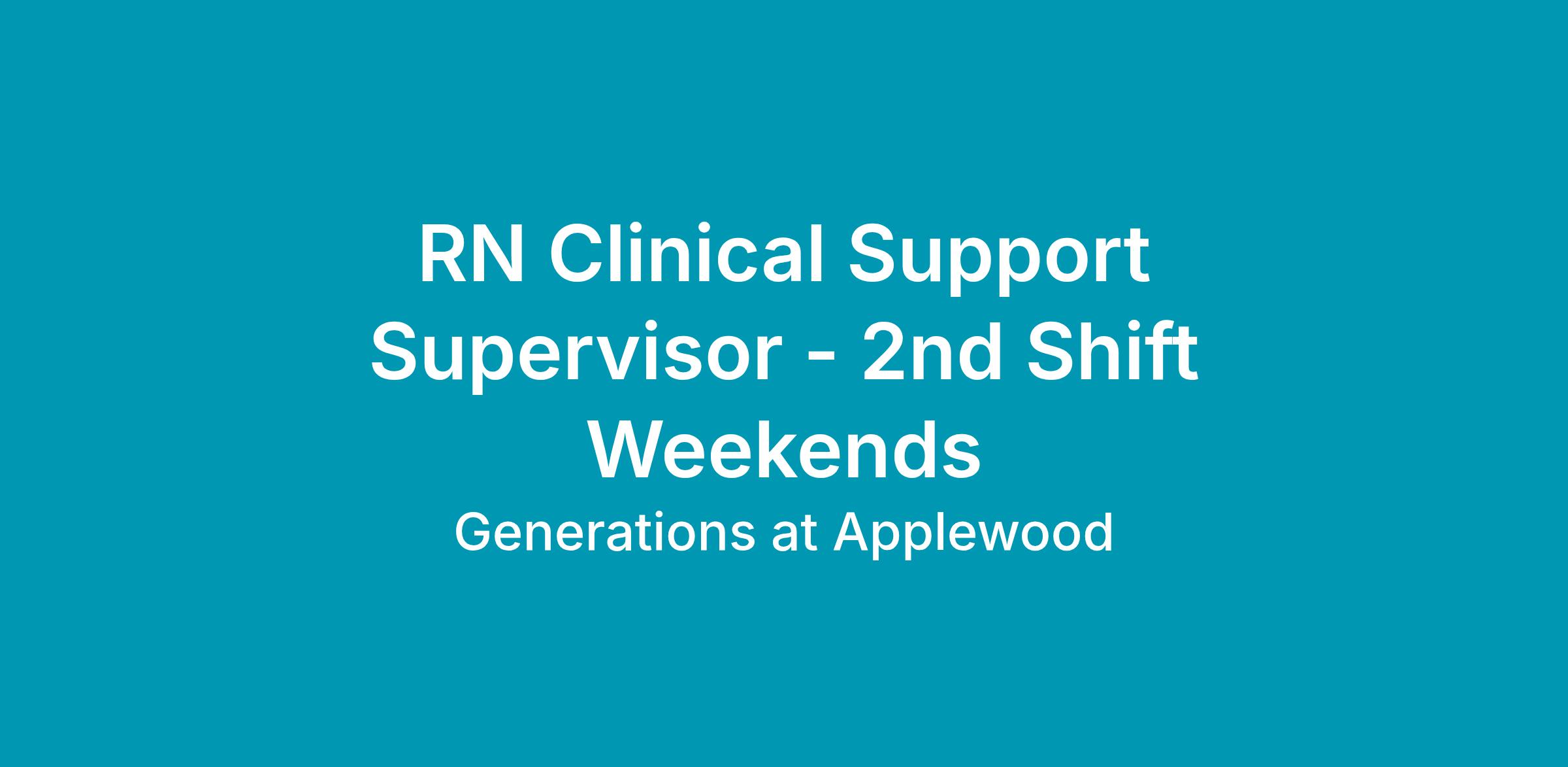 Generations at Applewood Seeks Part-Time Clinical Support Supervisor 11a-7p every other weekend, both Saturday and Sunday. Must be a Registered Nurse AND have experience working and/or supervising in a skilled nursing facility. Additional hours available as a floor nurse.