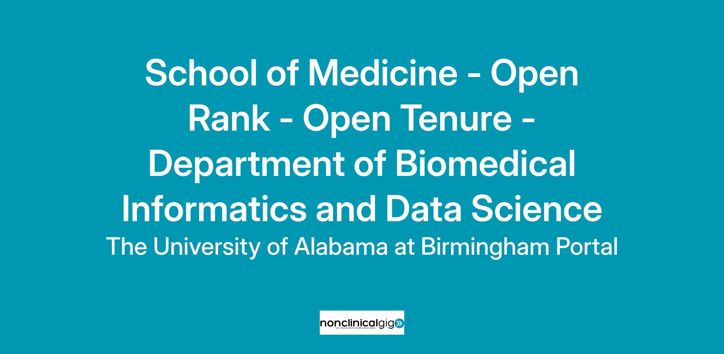 The University of Alabama at Birmingham ( UAB ) Department of Biomedical Informatics and Data Science ( DBIDS ) is seeking outstanding candidates for faculty positions in the field of biomedical informatics. Rank and tenure status will be determined based on qualifications and interests. Candidates must have an MD or other doctoral degree in a related field and relevant postdoctoral experience. Preference will be given to candidates with significant records of research accomplishment, scholarship and recognition in the fields of biomedical informatics, genomics and bioinformatics, clinical research informatics, health informatics, data science and big data analysis, data modeling, electronic health records and clinical information system, clinical decision support systems, disease genetics/genomics, artificial intelligence/Machine Learning (AI/ML), interoperability, human-computer interaction/cognitive informatics, medical imaging/signal data analysis/translational science, and natural language processing. The successful candidate will establish and maintain an independent funded research program that achieves national recognition for its contributions to the field. Advancement will also consider contributions to the educational and/or service missions of the Department. Opportunities exist for collaboration with UAB’s Center for Genomic Medicine, Personalized Medicine Institute, as well as academic and clinical departments across the University and UAB’s health system, comprising a rich and diverse “living laboratory” for informatics research and development. Opportunities for clinical practice, where appropriate, are available and encouraged. Faculty with expertise in generative AI method development, virtual clinical trial simulations, individualized digital twin modeling, and large-scale data mining of gene-disease-drug relationships may be considered for an appointment with the new Systems Pharmacology Research Center ( SPARC ) and generous additional startup resources to conduct drug discovery team science.