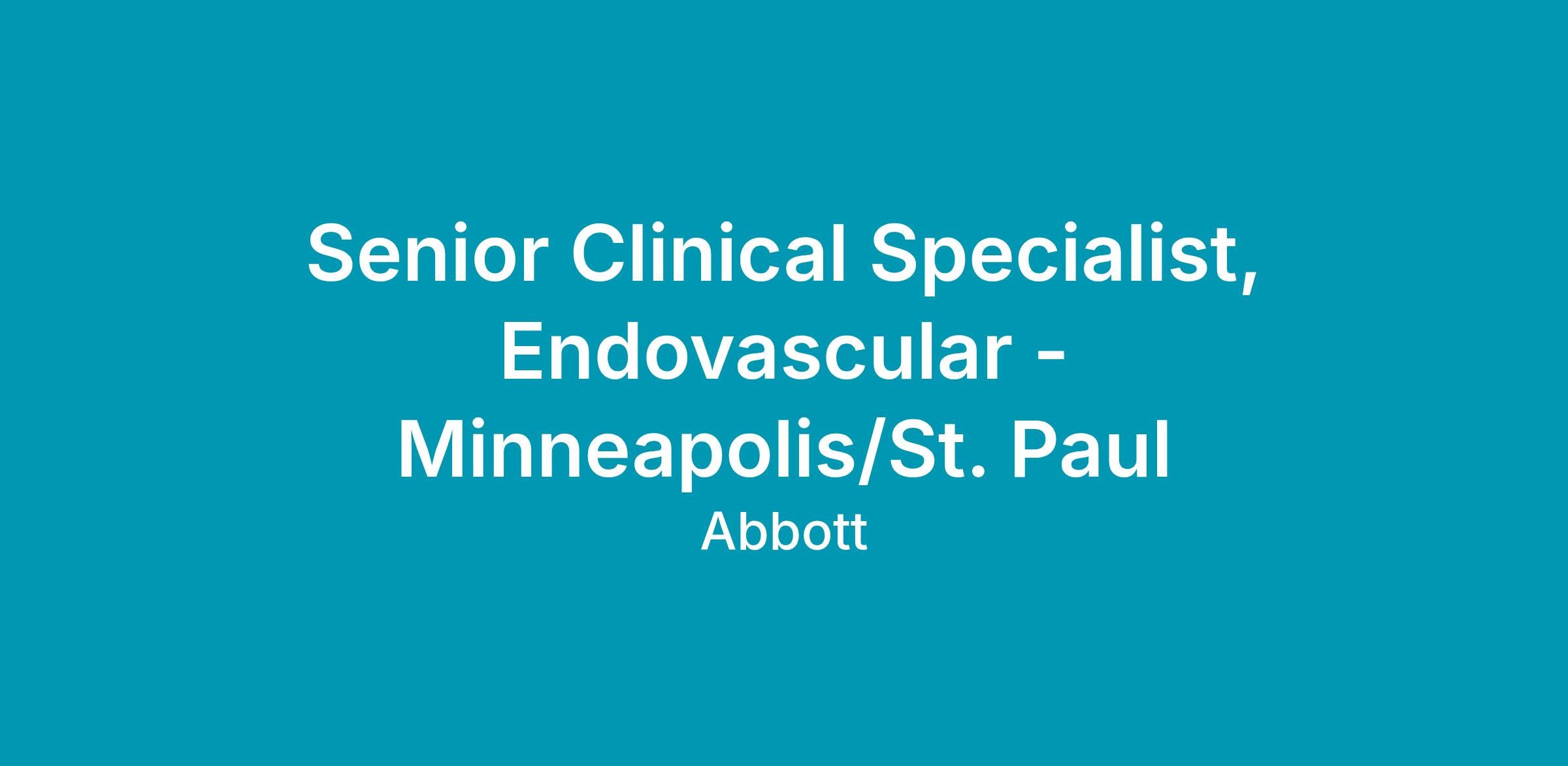 We currently have an opportunity for a Clinical Specialist, Endovascular, in Minneapolis/St. Paul. The Clinical Specialist will primarily be responsible for case planning, case support coverage, and product pull- through throughout the designated territory, and throughout the Region as needed. The Clinical Specialist will promote Vascular products through education, service and training of customers in the hospital setting. The Clinical Specialist will provide clinical education and sales support in order to assist in achieving projected sales goals, increasing sales revenues within assigned product lines, and increasing market share. This position will have a heavy focus on Vessel Closure.