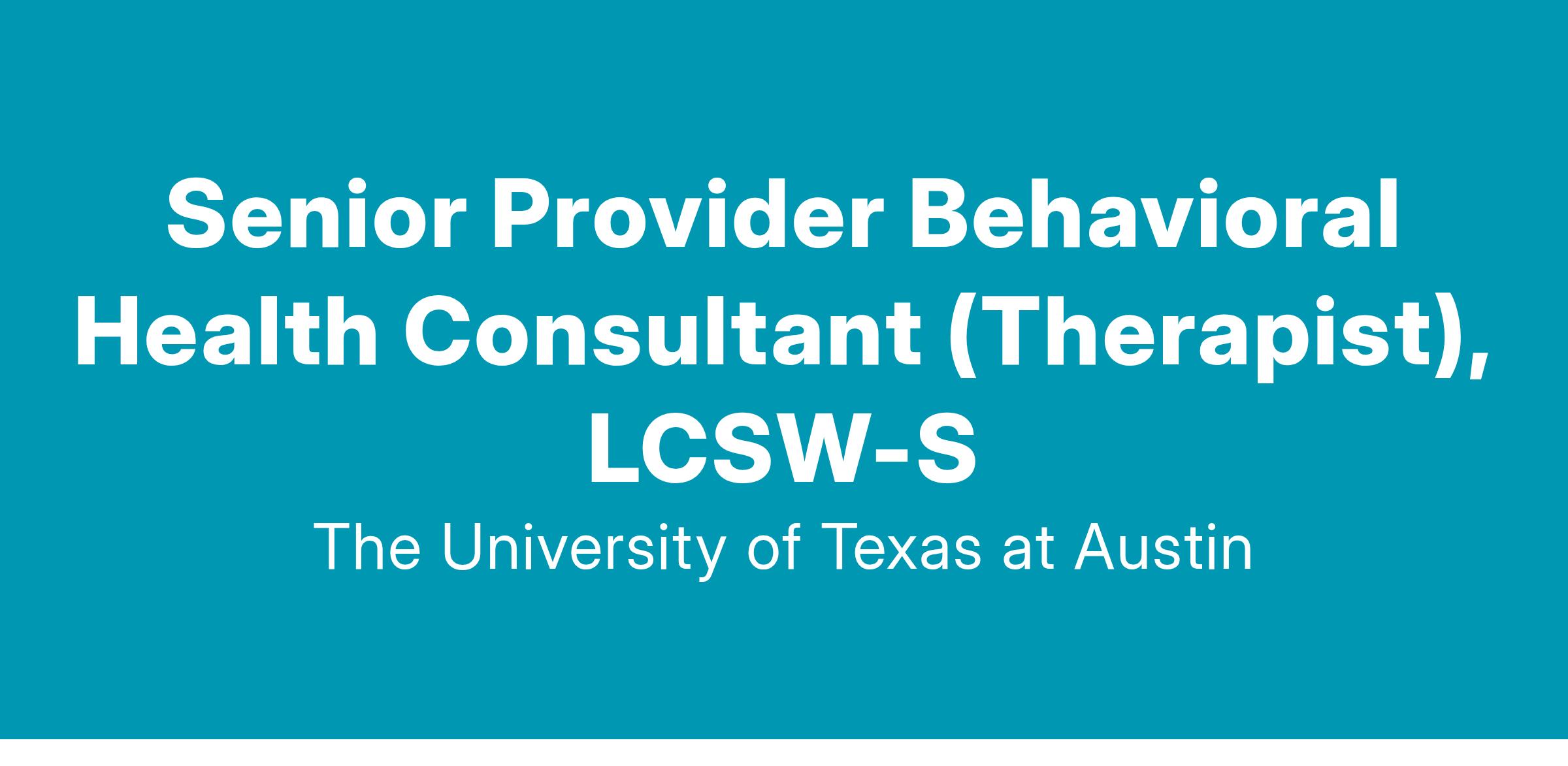 The Department of Psychiatry and Behavioral Sciences at the Dell Medical School is seeking a Senior Provider Behavioral Health Consultant, LCSW-S. This position has an end date of 8/31/2026, but may be renewable based upon availability of funding, work performance, and progress toward goals.