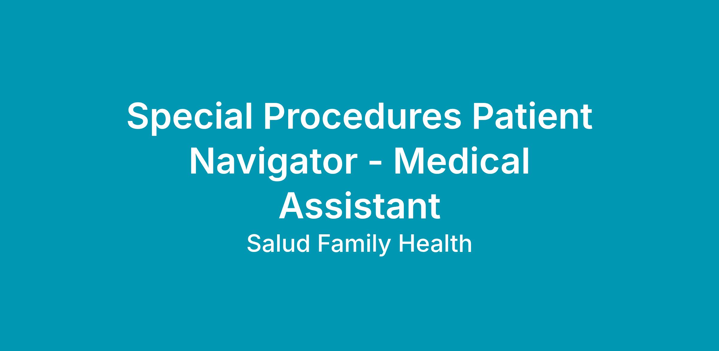 The Special Procedure Patient Navigator - Medical Assistant will perform the duties necessary to coordinate the care of the patients who undergo special procedures such as a colonoscopy, esophagogastroduodenoscopy (EGD) or Stress Test as part of the Special Procedures Program at Salud Family Health Centers. The Special Procedure Patient Navigator approaches his/her tasks in a team-based fashion that supports patients and their families in self-management, self-efficacy and behavior change.