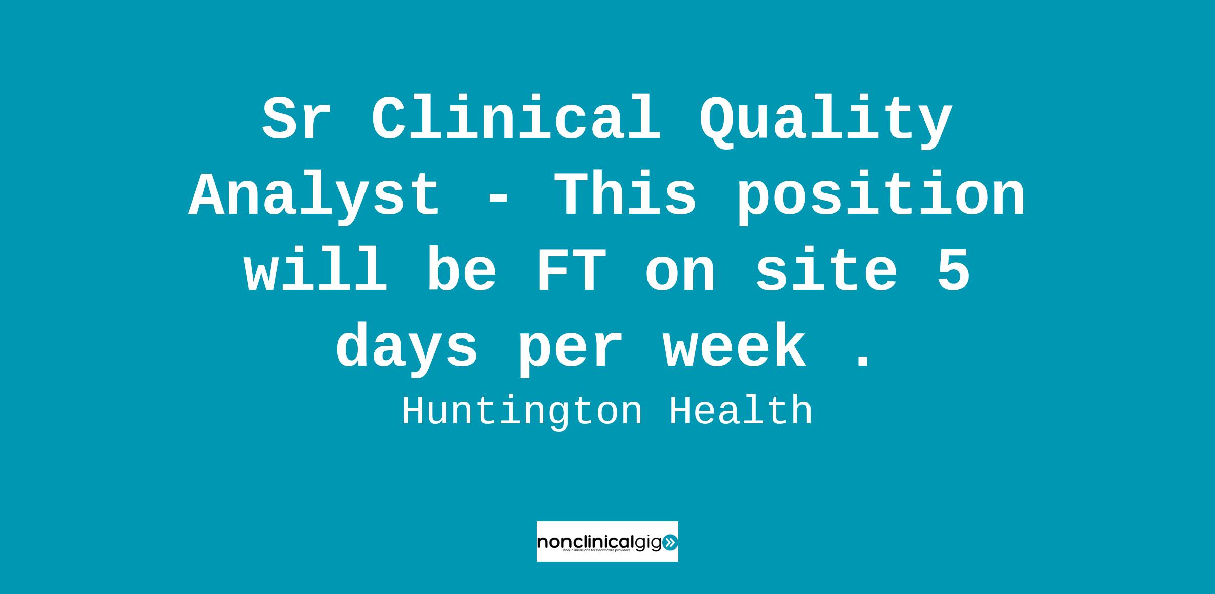 The Sr Clinical Quality Analyst is responsible for high quality data analytics which support Huntington Hospital’s need for analytical tools, and solutions that are generated by Quality Management, Infection Prevention, Employee Health, and the Huntington Ambulatory Care Center (collectivity referred to as QM in this document). The Analyst understands how data is turned into information and knowledge, and how the knowledge supports and promotes continuous improvement in quality care and patient safety throughout the Huntington Hospital enterprise. Responsibilities include, but are not limited to:Worker Type: