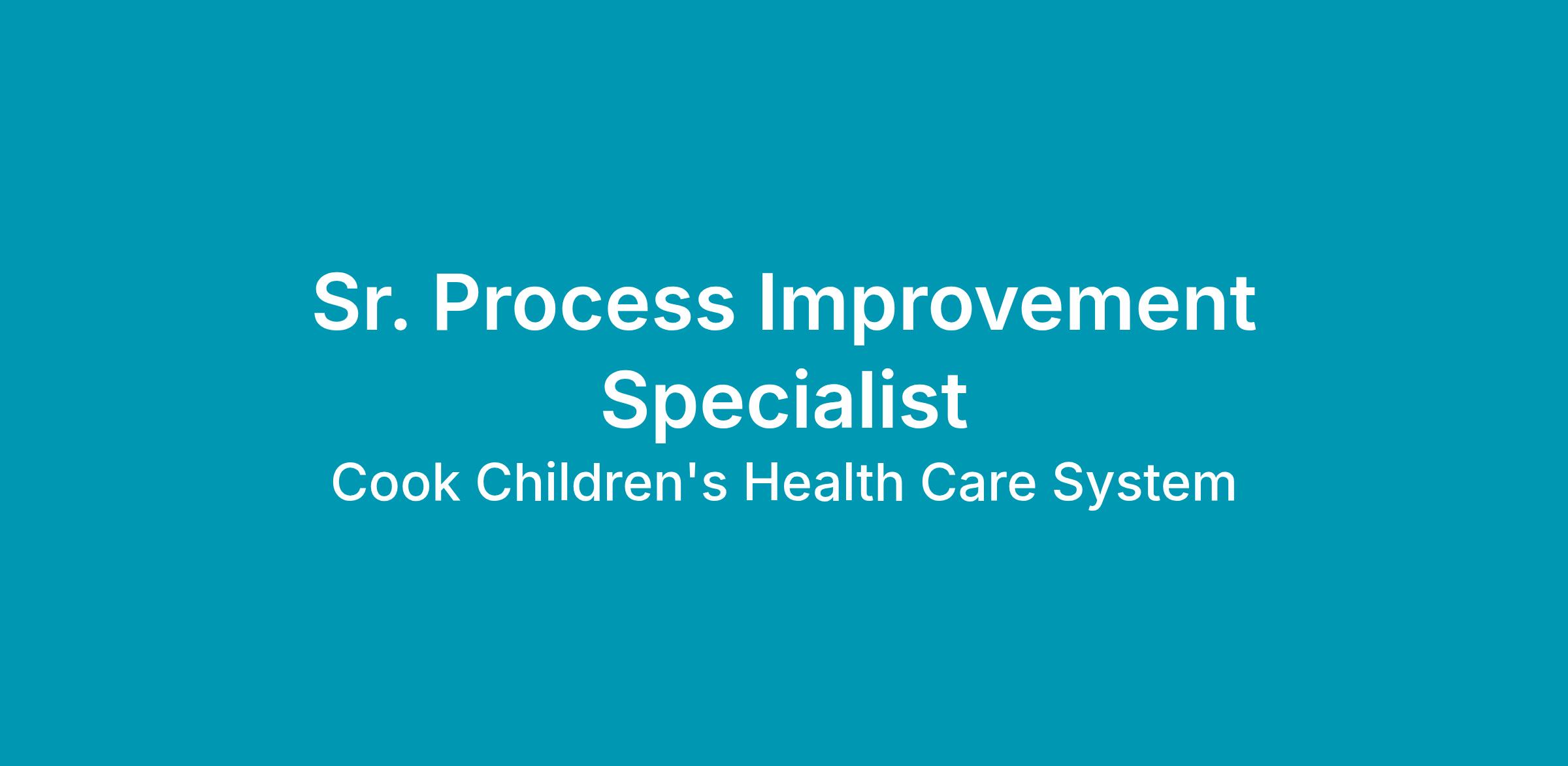 The Sr. Specialist works collaboratively with teams and department leaders throughout Cook Children Healthcare System (CCHCS) to demonstrate our values and achieve Our Promise through the implementation of process improvement initiatives and programs. The Sr. Specialist acts as an internal expert, consultant and organizational process improvement champion who leads departmental and cross-functional teams, and assists with the coaching and mentoring of Green Belts, through all aspects of the continuous improvement effort using Lean, Six Sigma and other effective strategies and methodologies. The Sr. Specialist facilitates the identification, understanding and improvement of process issues by using appropriate quantitative and qualitative tools. The Sr. Specialist will assist with the development and delivery of process improvement training and education to the organization. As an agent of change, the Sr. Specialist will serve as a catalyst to create a culture that continuously strives for operational excellence and embraces the principles of process improvement. This role is expected to obtain the applicable lean six sigma certifications to perform the job functions.