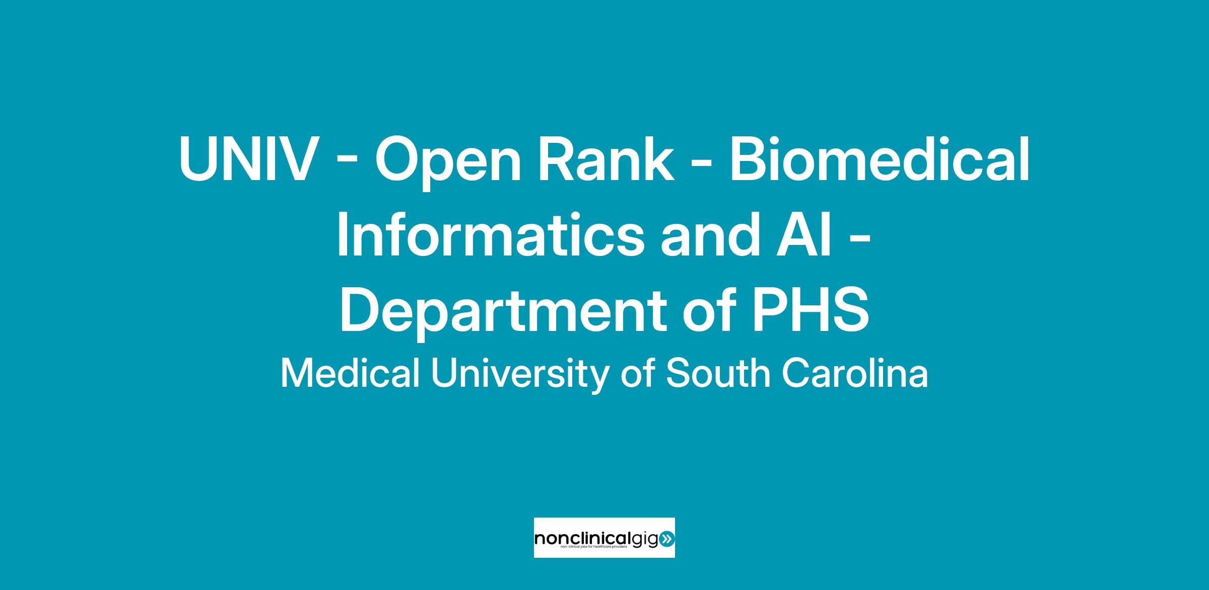 The Division of Biomedical Informatics and AI in the Department of Public Health Sciences at the Medical University of South Carolina (MUSC) College of Medicine invites applications for full-time, tenure-track or non-tenure track open rank faculty positions in the field of biomedical informatics. We seek outstanding candidates with expertise in biomedical informatics methods development and applications, including but not limited to bioinformatics, translational bioinformatics, clinical informatics, clinical research informatics, consumer health informatics, and public health informatics. Candidates with a strong background in Artificial Intelligence and Machine Learning are especially encouraged to apply. Faculty rank and track will be determined based on qualifications and experience.Entity