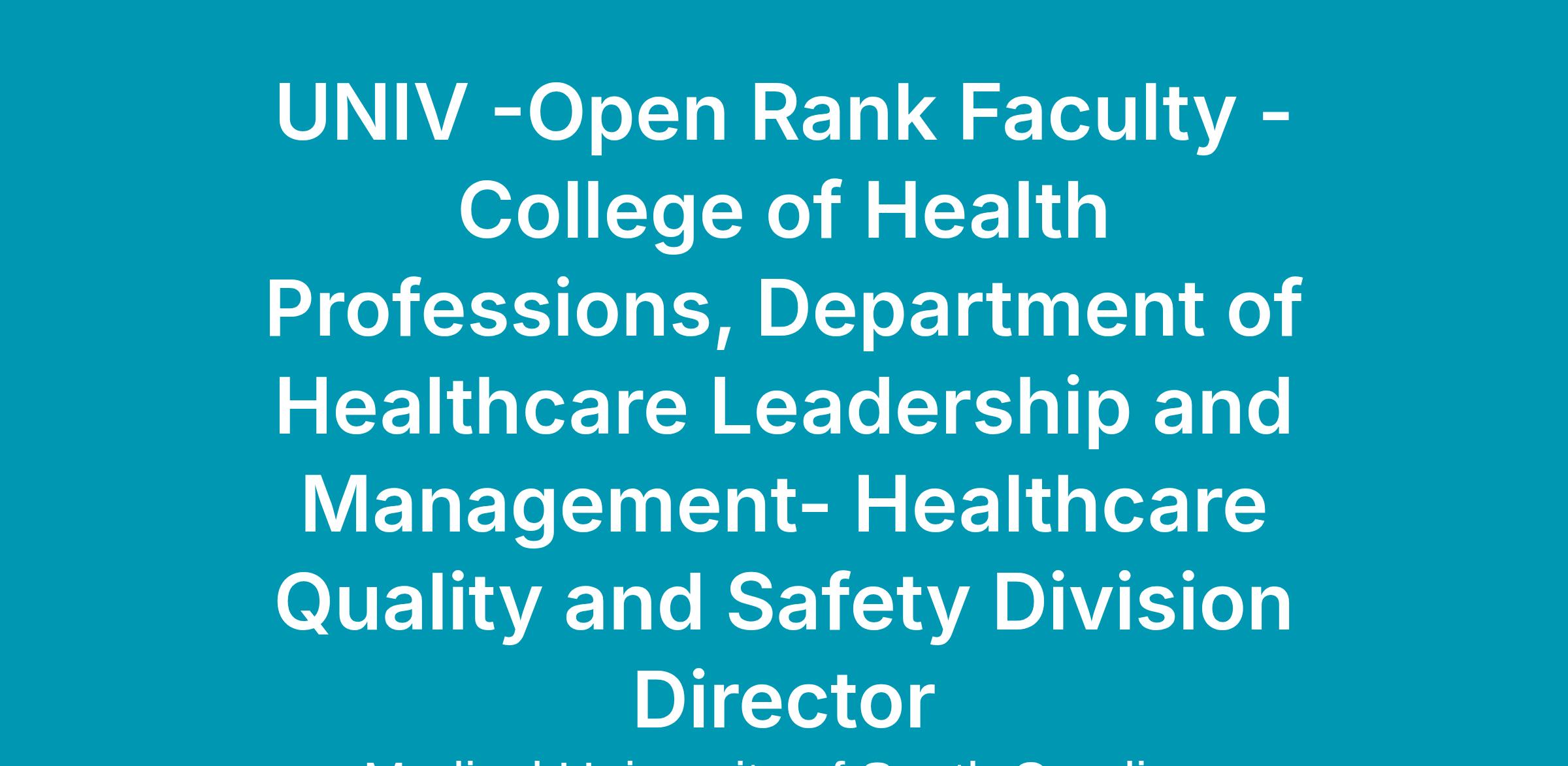 The Department of Healthcare Leadership and Management at the Medical University of South Carolina (MUSC) invites applications for the role of Division Director – Master of Science in Healthcare Quality & Safety, referred to hereafter as Division Director. This is a full-time faculty position with administrative responsibilities, offered on the academic educator track (tenure eligible) with rank and salary commensurate with qualifications and experience.Entity