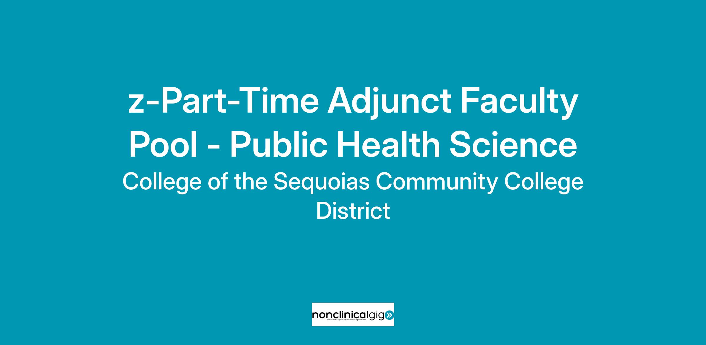 College of the Sequoias Community College District accepts applications for part-time adjunct faculty pools to teach Public Health Science within its P.E. Department continuously. Screening committees will conduct the screening of candidates. Meeting the minimum qualifications for a position does not assure the applicant of an interview. If the department does not have an immediate need to add candidates to their pool, applications remain in the queue for consideration until the need arises, or for one year in active status.